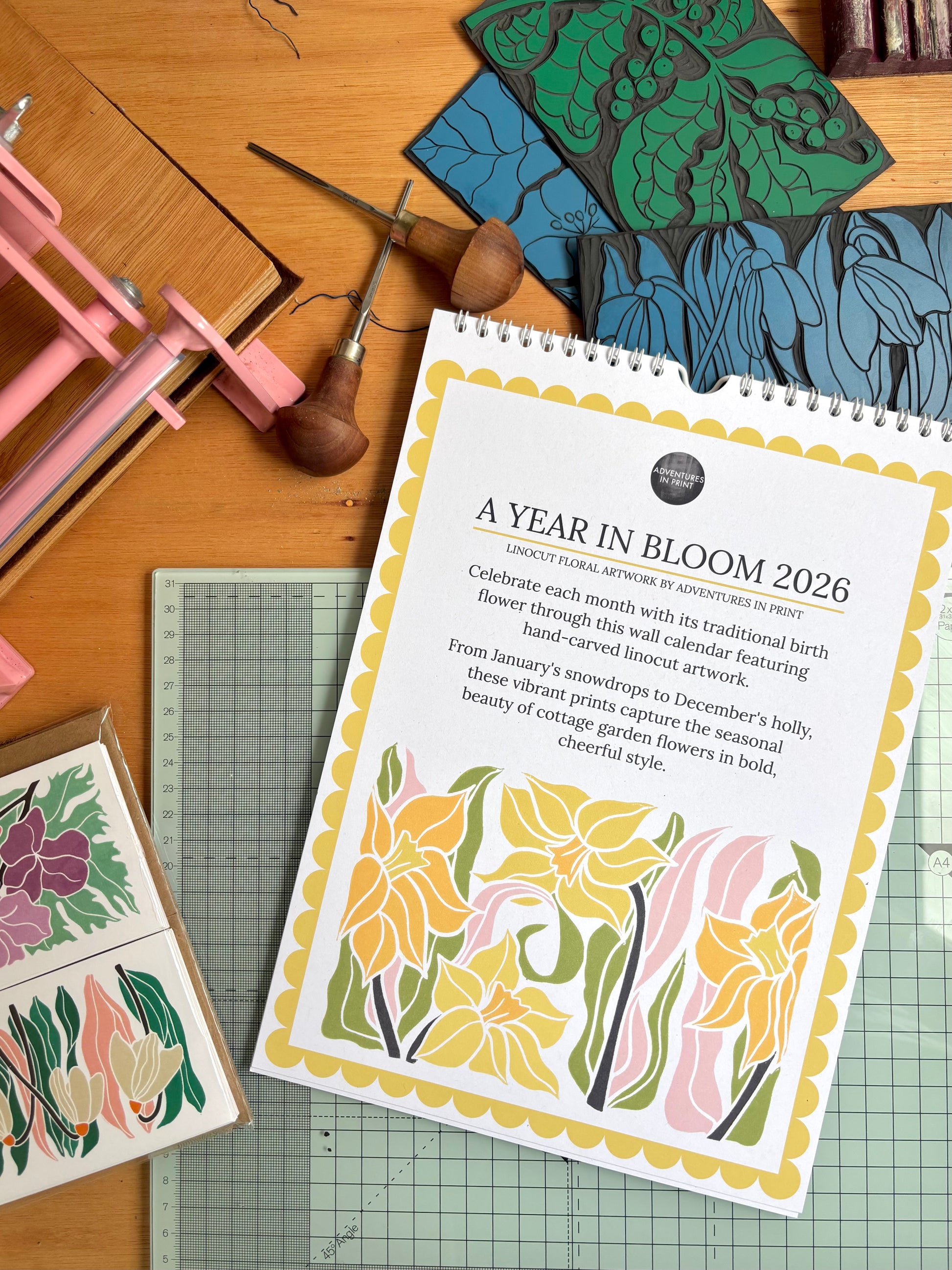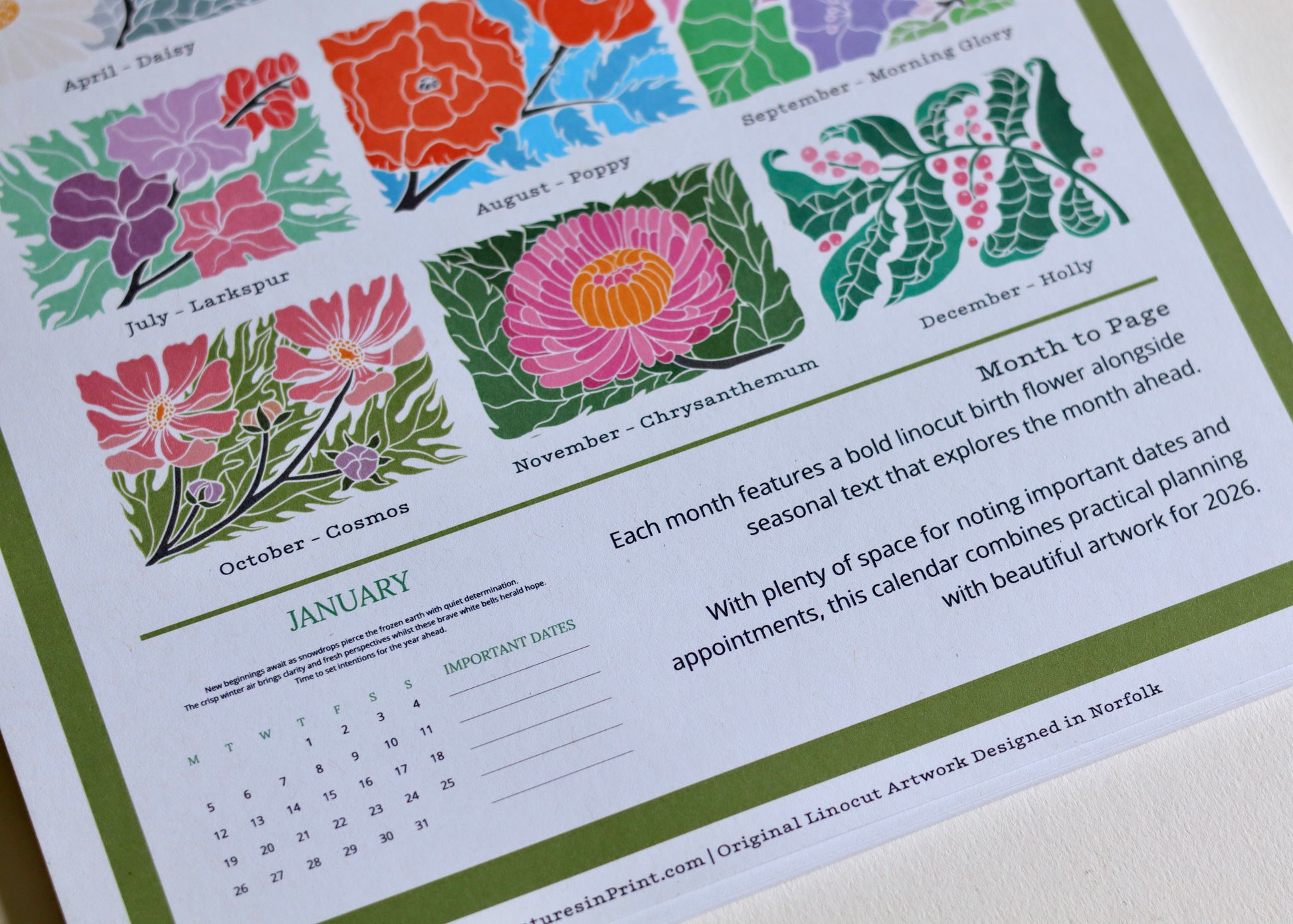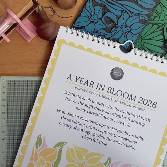 Transform your wall into a gallery of seasonal beauty with 12 stunning linocut prints, each celebrating a traditional birth flower. From January's hopeful snowdrops to December's festive holly, these vibrant designs capture the essence of cottage garden charm in bold, graphic style.