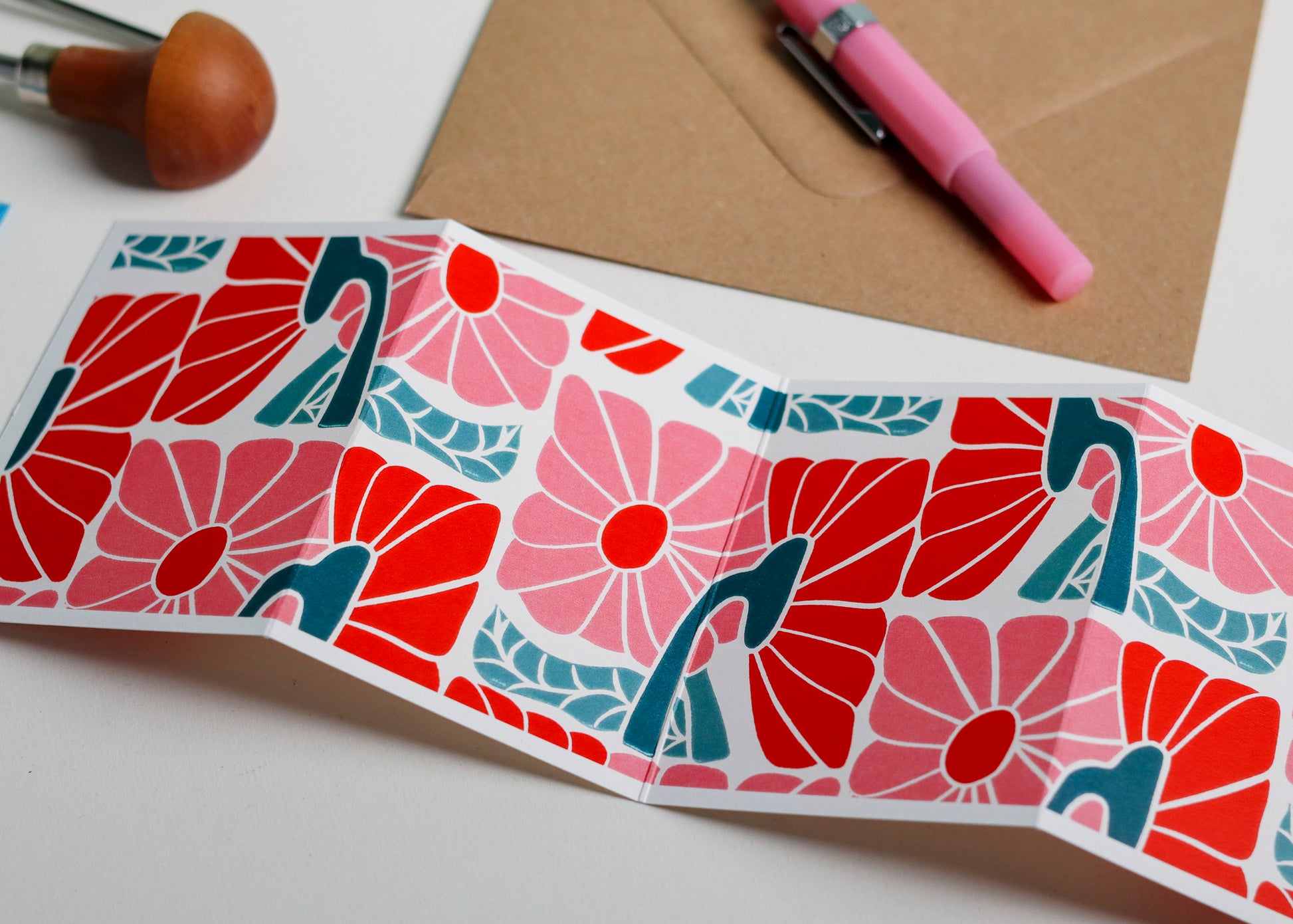 Bloom Burst is a fun, energetic and bold floral design. Radiating energy in each of its carved petals, bringing messages of cheer. A joyful abundance of flowers bursting across this garland concertina card. An abstract linocut floral design, which is bold, confident and unapologetic!