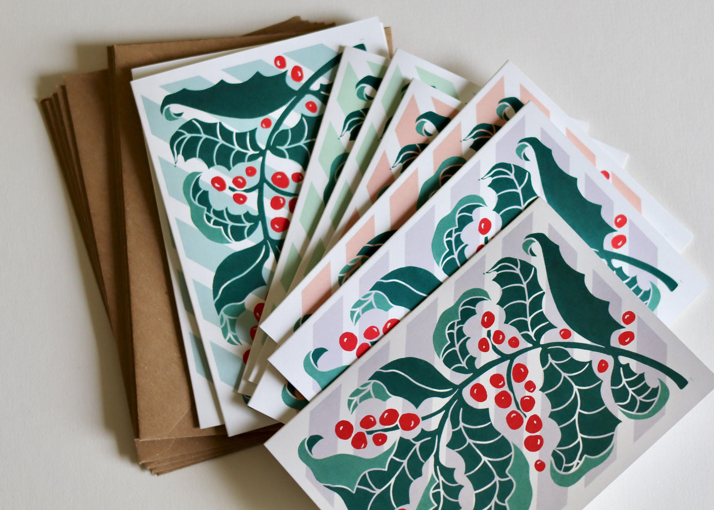 Bring a touch of seasonal cheer to your correspondence with these charming holly notecards. Crafted from an original linocut design, each card features a vibrant, intricate pattern of holly leaves and berries in a classic green and red colour palette on a fun candy-striped background.