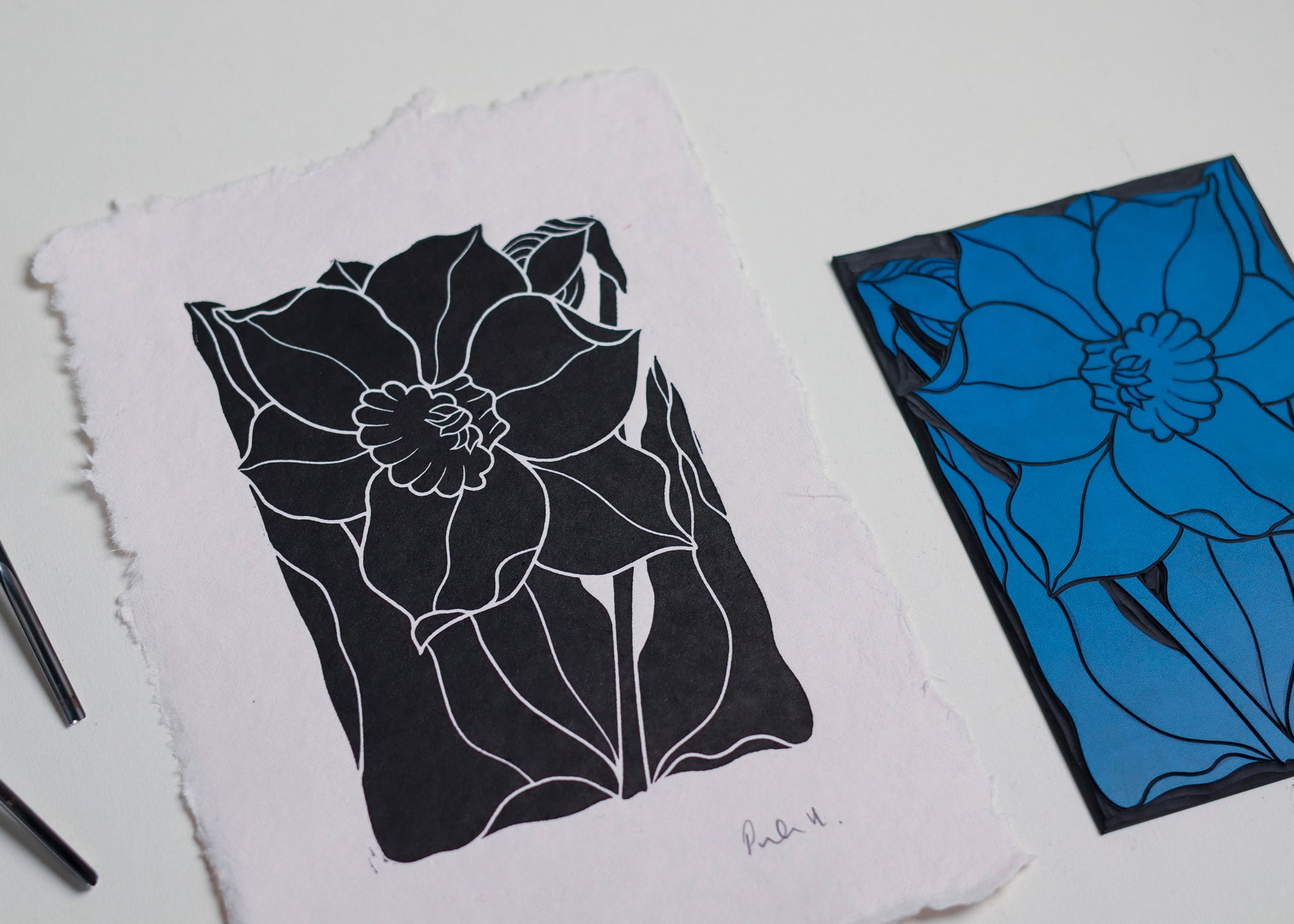 Dancing Daffodil Linocut | Handprinted A5 Art Print on Cotton Rag Paper