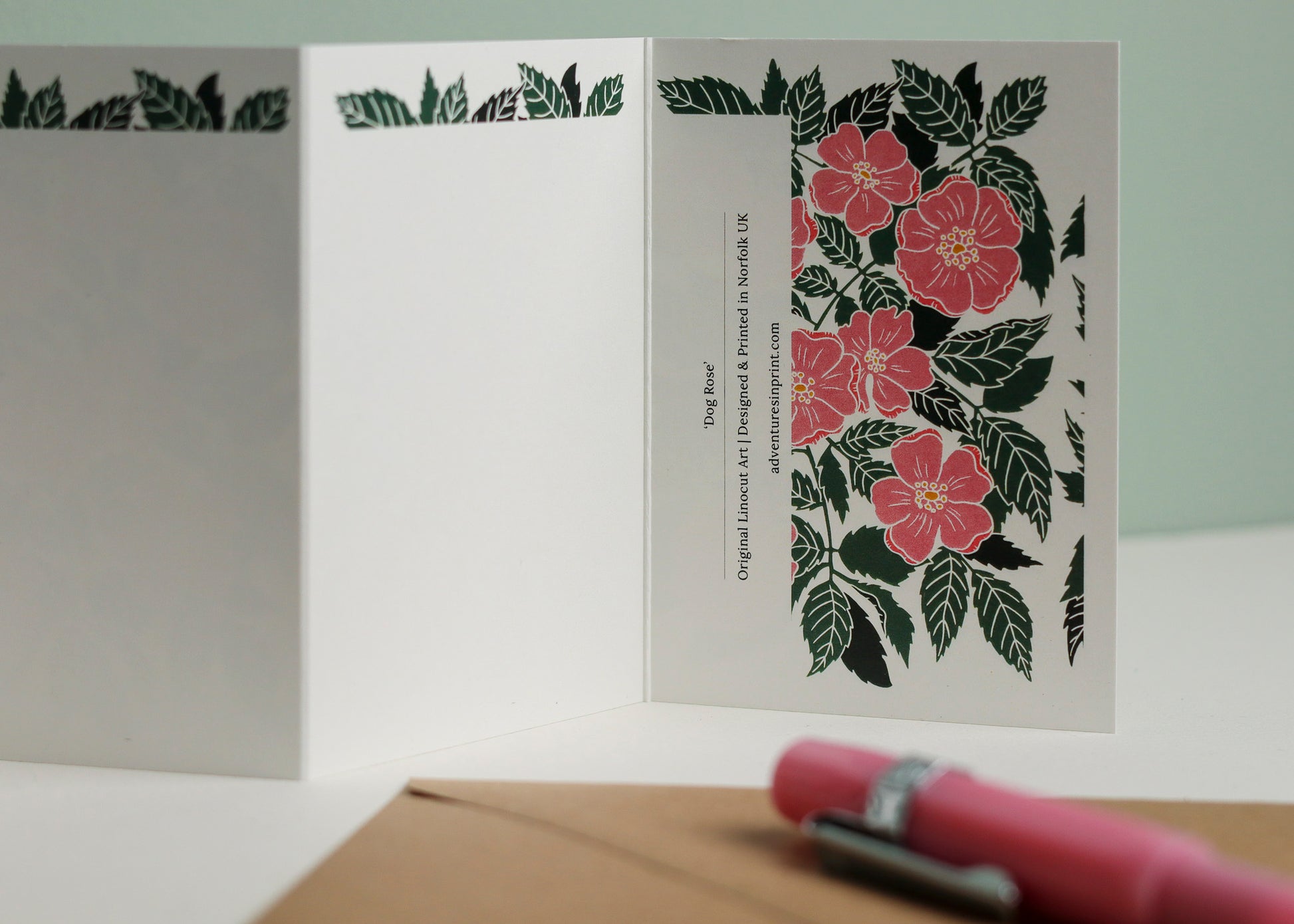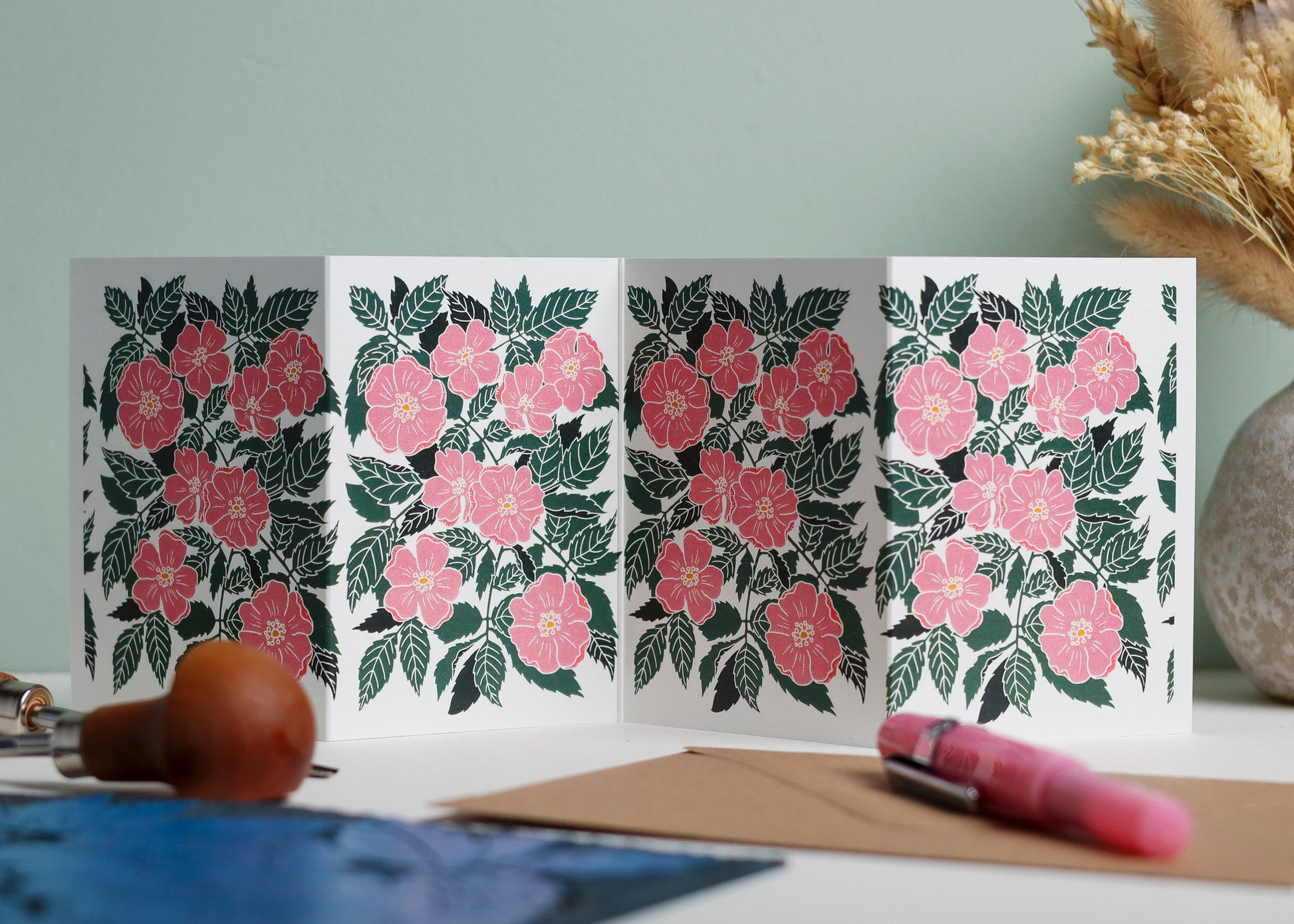 The dog rose is one of Britain's most beloved wild flowers, scrambling through hedgerows and threading its delicate blooms through country lanes each summer. This linocut is filled with simple pink petals, framed by deeply veined leaves that tell the story of wind and weather.