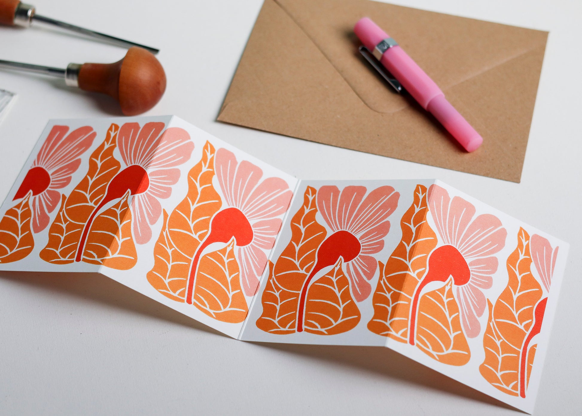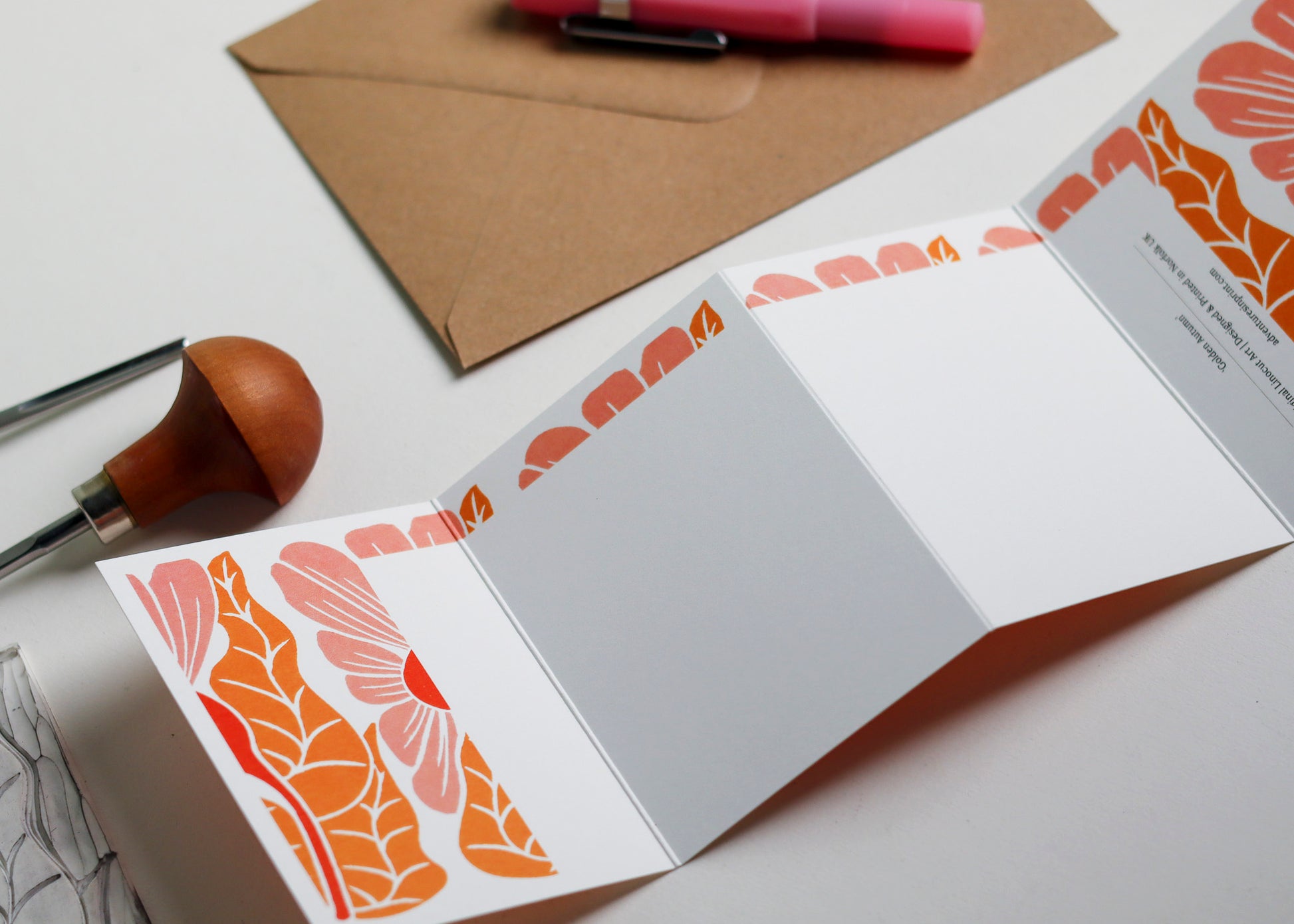 Golden Autumn is a celebration of the season's warmth captured in a single, stylised bloom. This hand-carved linocut design features an abstract flower in rich sunset hues – burnt orange, coral pink, and deep amber that evoke the golden light of autumn afternoons.