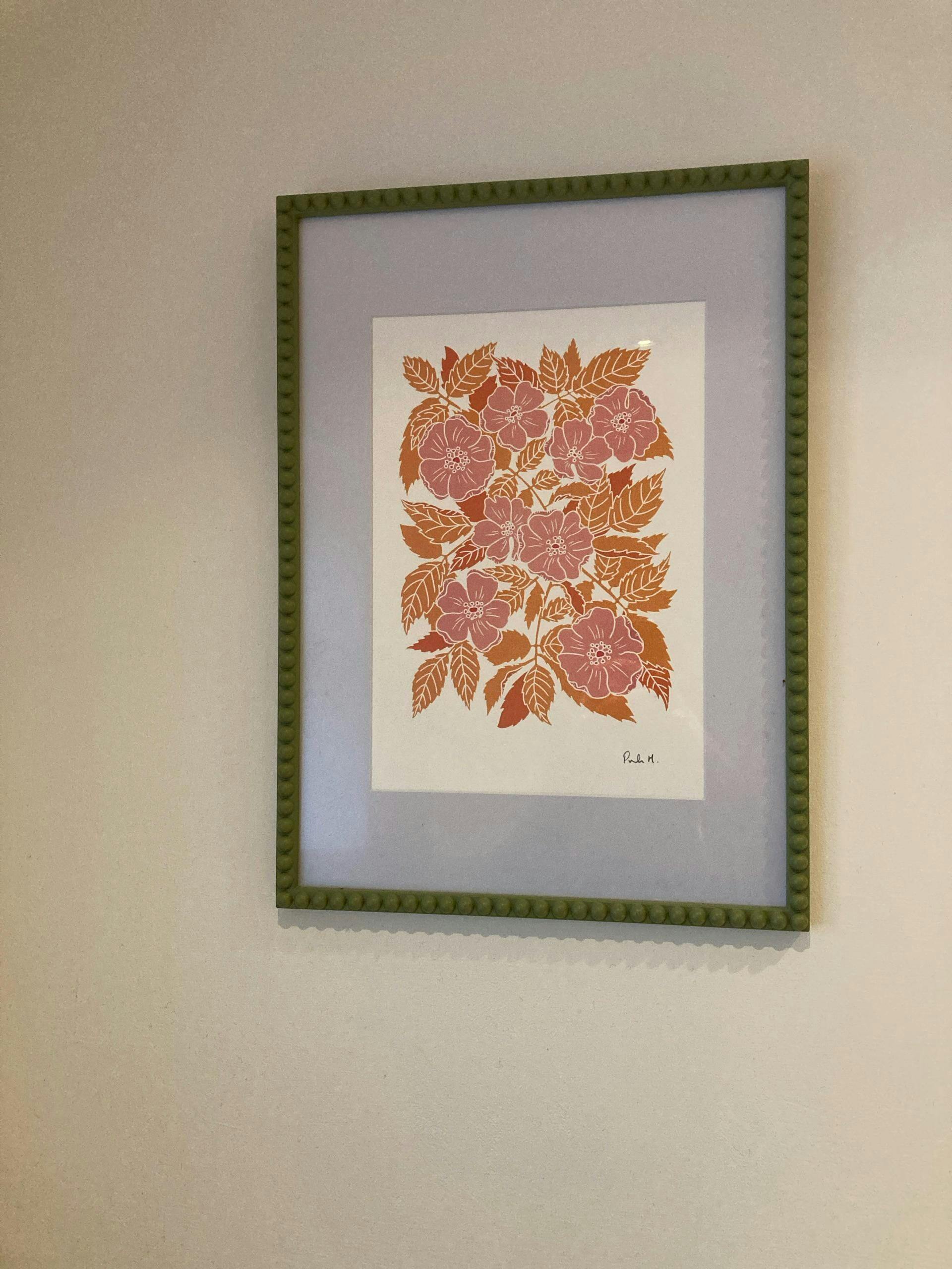 Brighten up your wall space with this version of our dog rose linocut print, reworked in a summer evening inspired colour palette of pinks and oranges, originally created using traditional relief printmaking techniques.