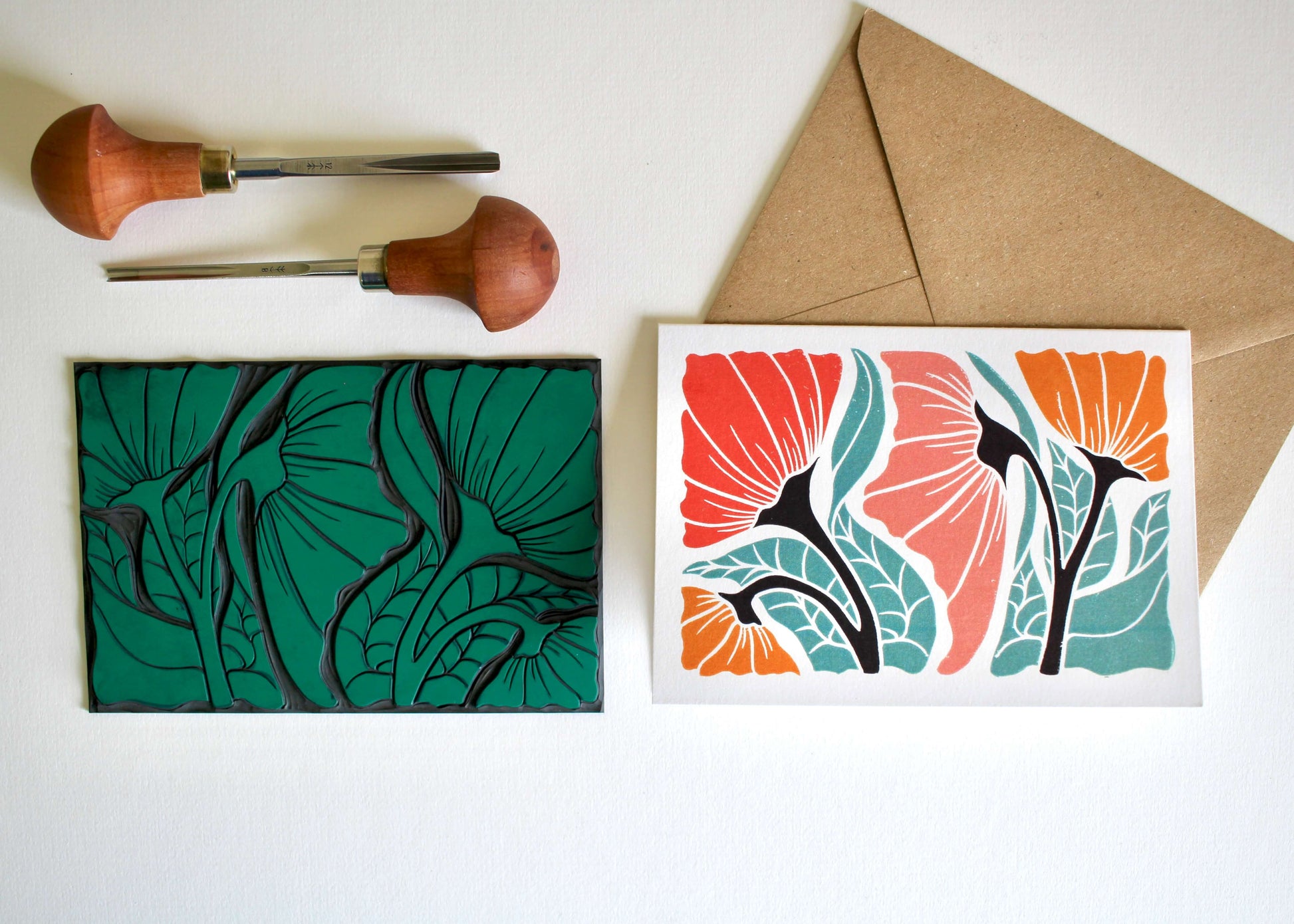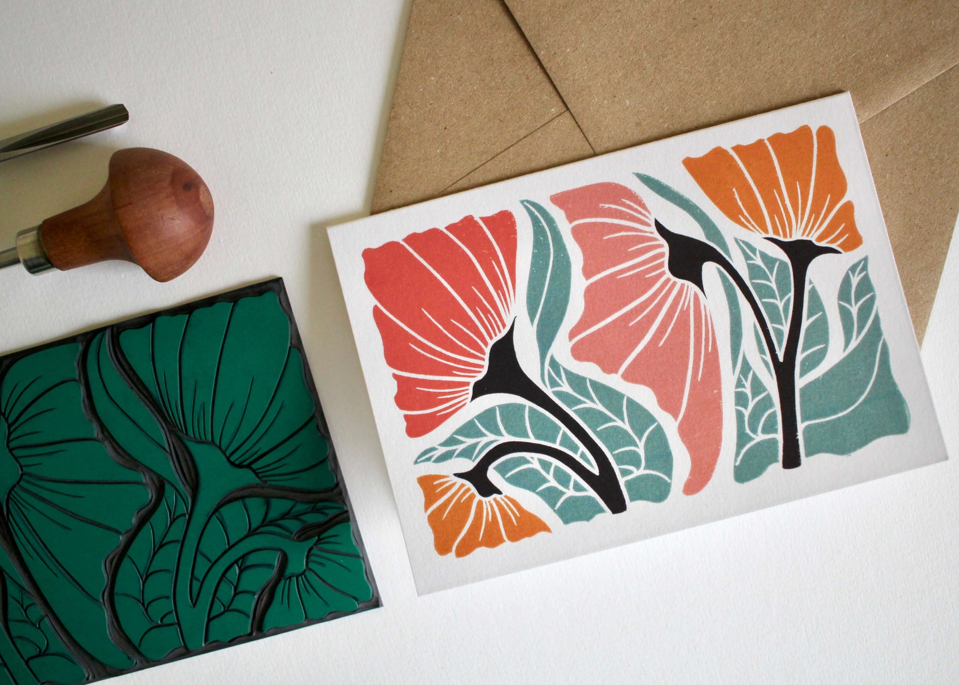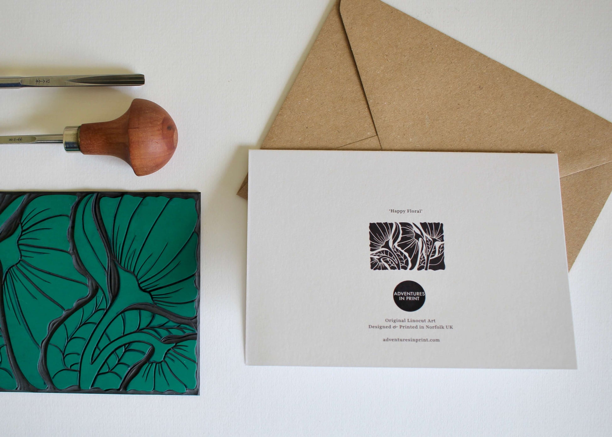 Happy Floral Linocut Greeting Card | Single Card & Envelope