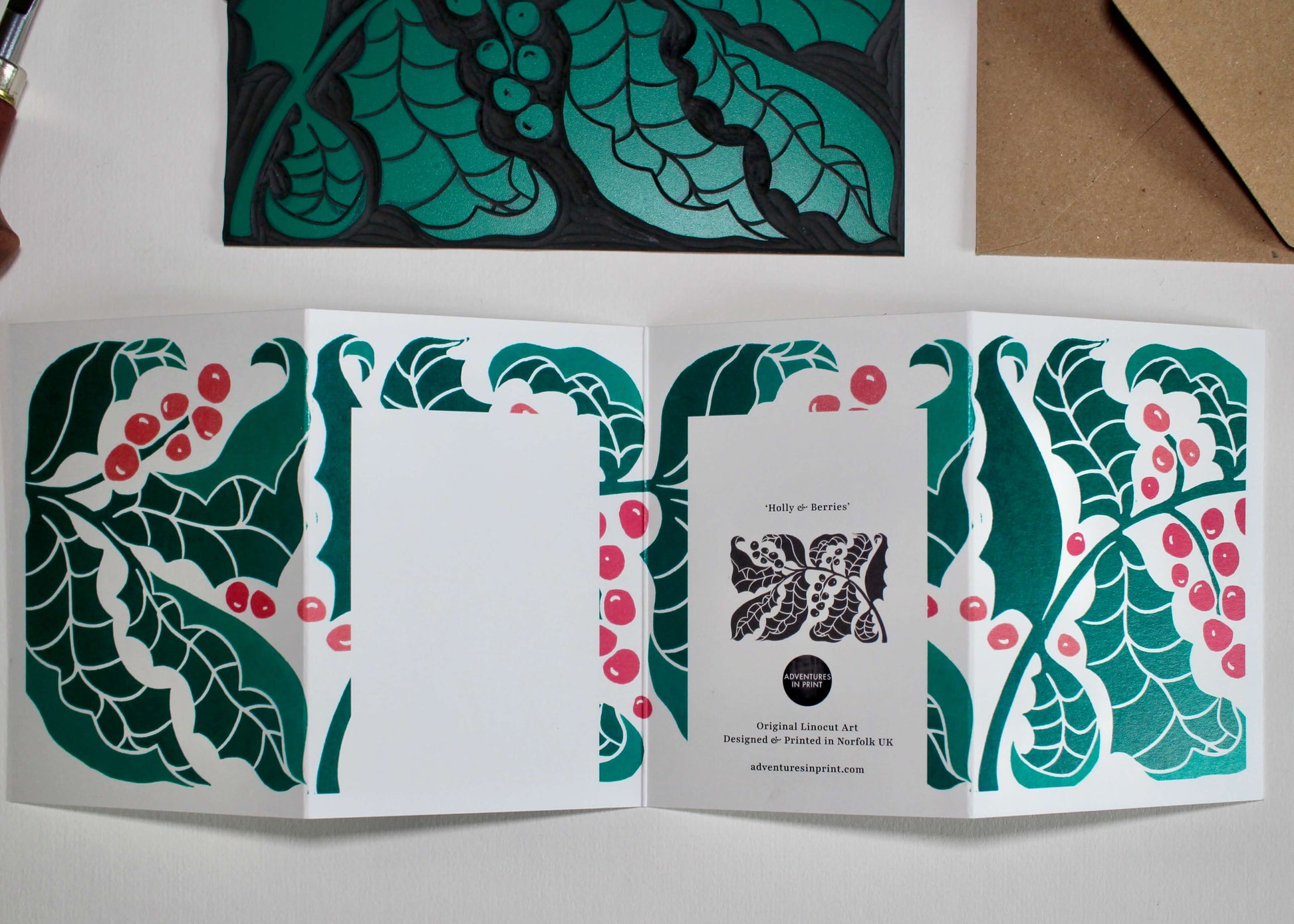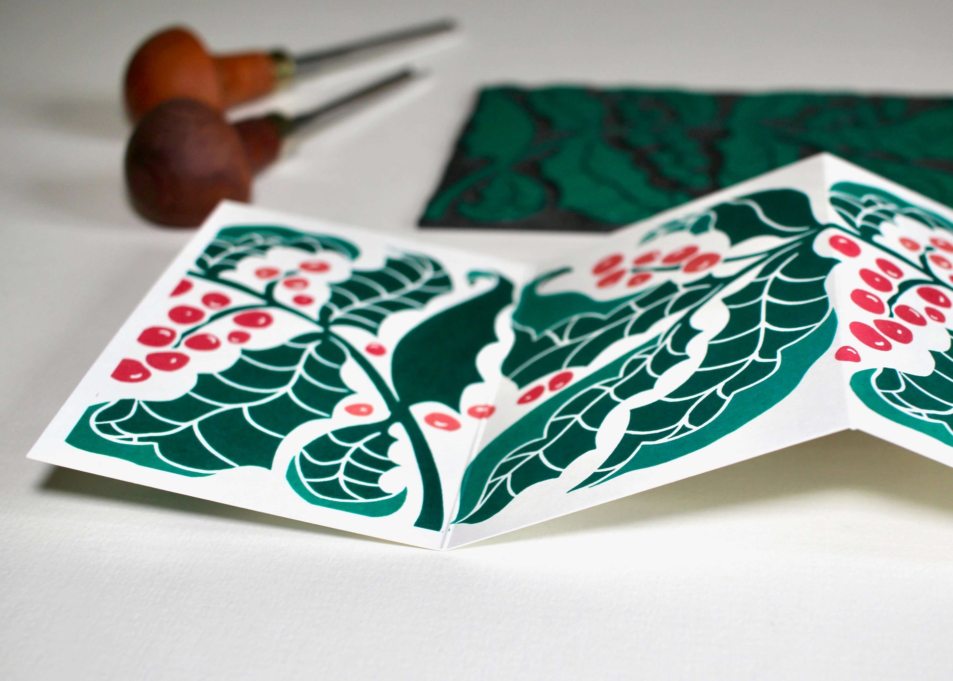 Holly & Berries Linocut Concertina Card | Single Card & Envelope