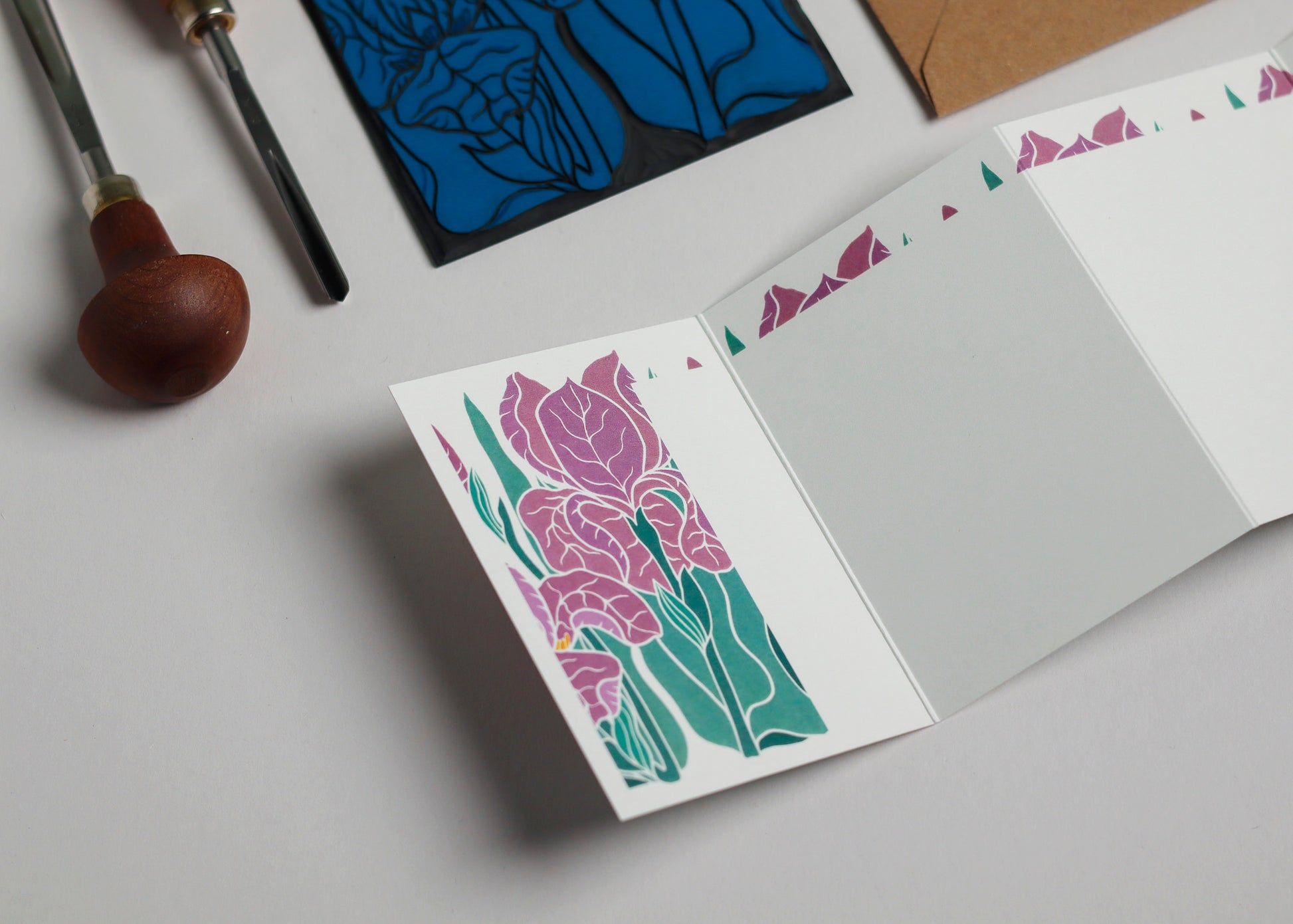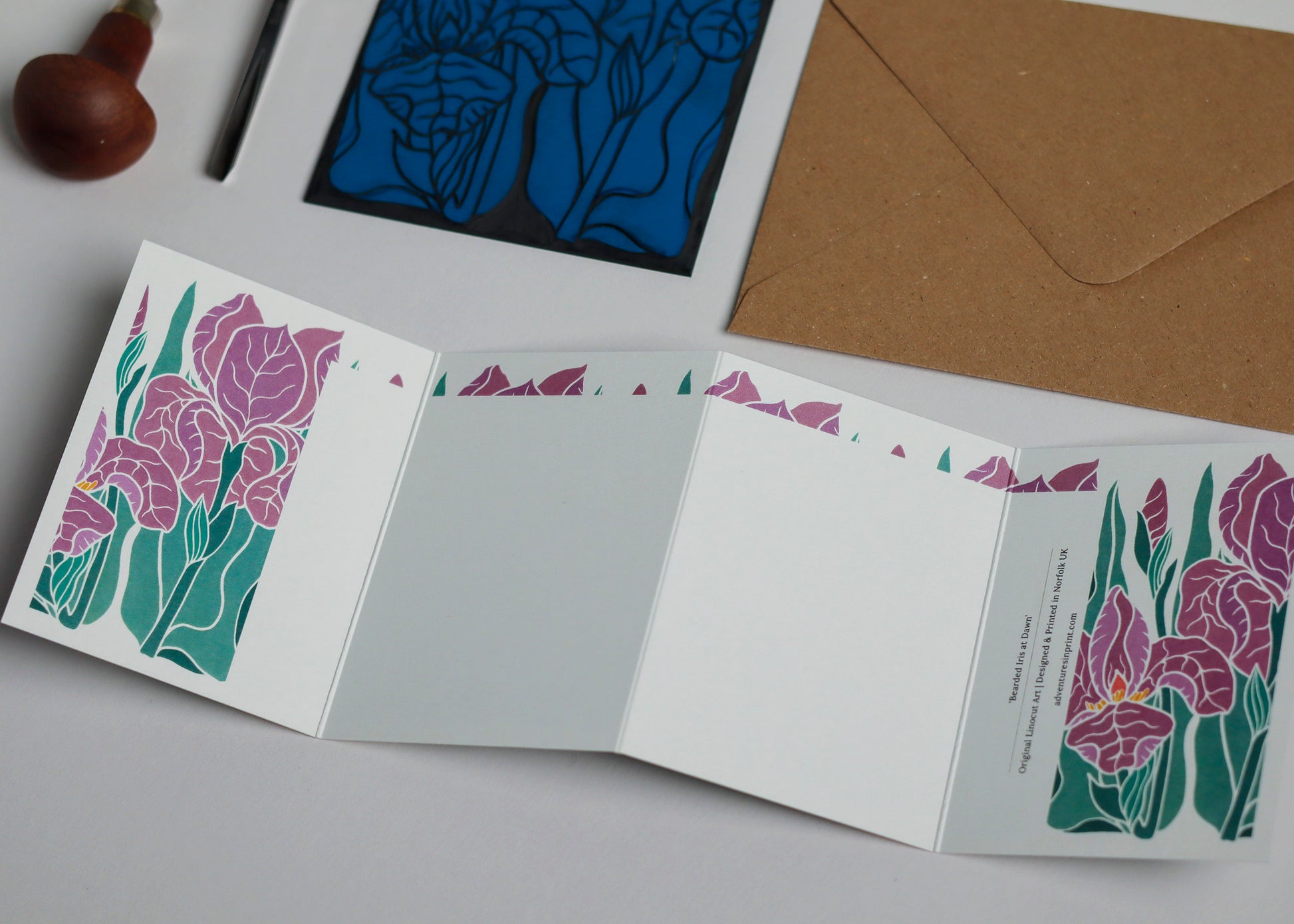 Sculptural petals in dusky mauve and soft purple - iris reimagined in evening tones, as if glimpsed in a garden at dusk when the light has softened and colours have deepened. This original linocut portrays their dramatic ruffled form in the muted palette of dusk. Each intricate petal carved with care in my Norfolk countryside studio.