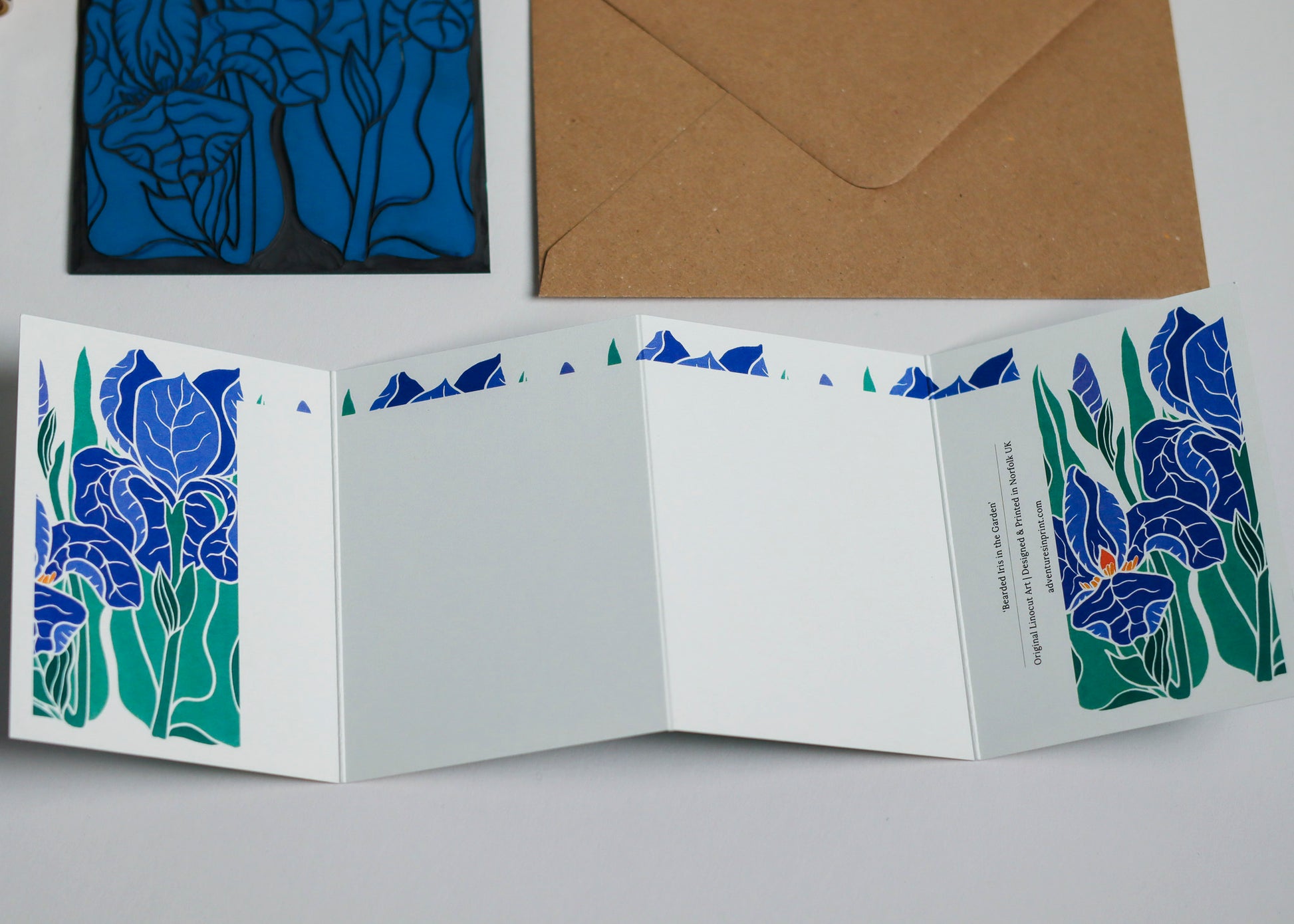 Sculptural petals in classic blue-purple with golden beards - the iris of cottage garden borders and carefully tended plots. Sculptural, elegant, unmistakably iris. This original linocut design captures their dramatic form in traditional blues and golds. Each intricate petal carved with care into linoleum in my Norfolk countryside studio.