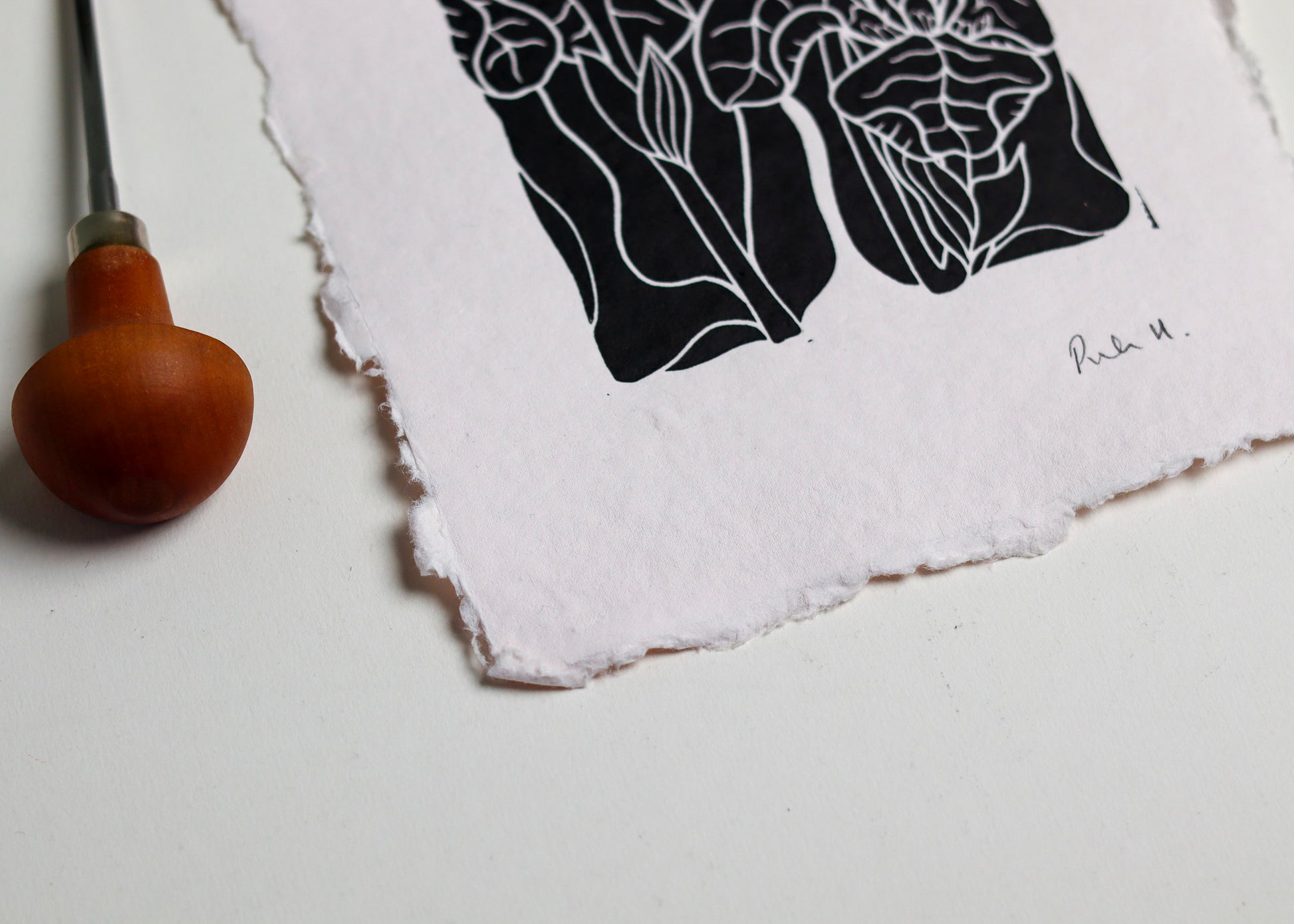 An original, hand printed artwork on luxuriously thick 250gsm cotton rag paper, which is acid-free & pH neutral. It features four deckled edges and natural flecks throughout for that perfectly imperfect finish. Printed using professional linocut ink.