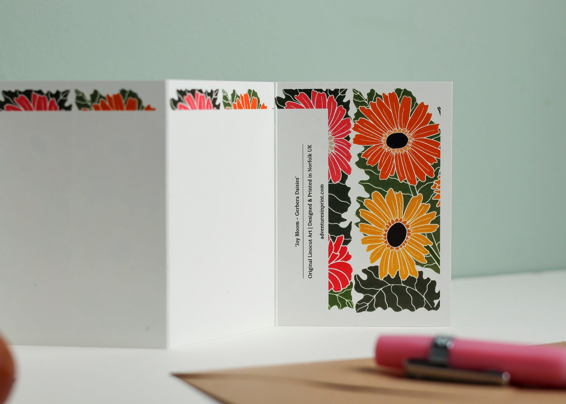 These cheerful Gerbera daisies embody the uncomplicated joy I'm always seeking in my work. An original linocut design carved in my Norfolk countryside studio, each petal captures that perfect symmetry that makes these blooms so satisfying - nature's own mandala of happiness.