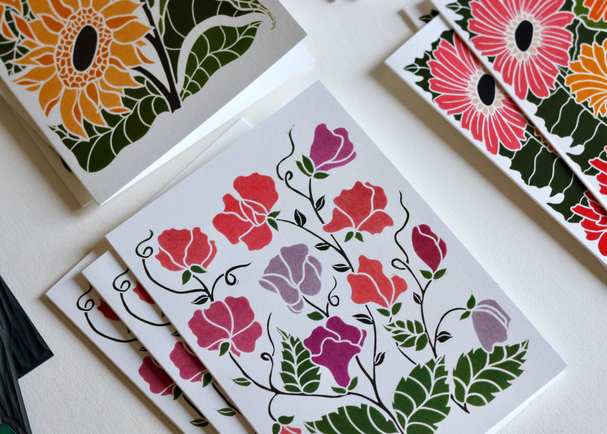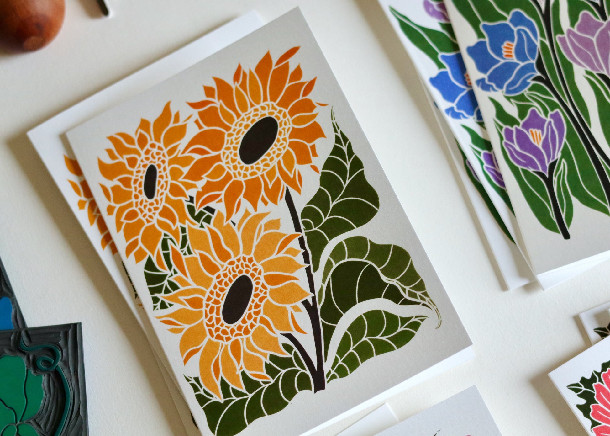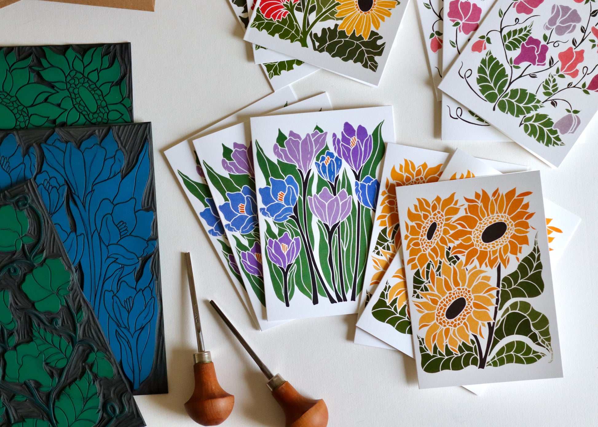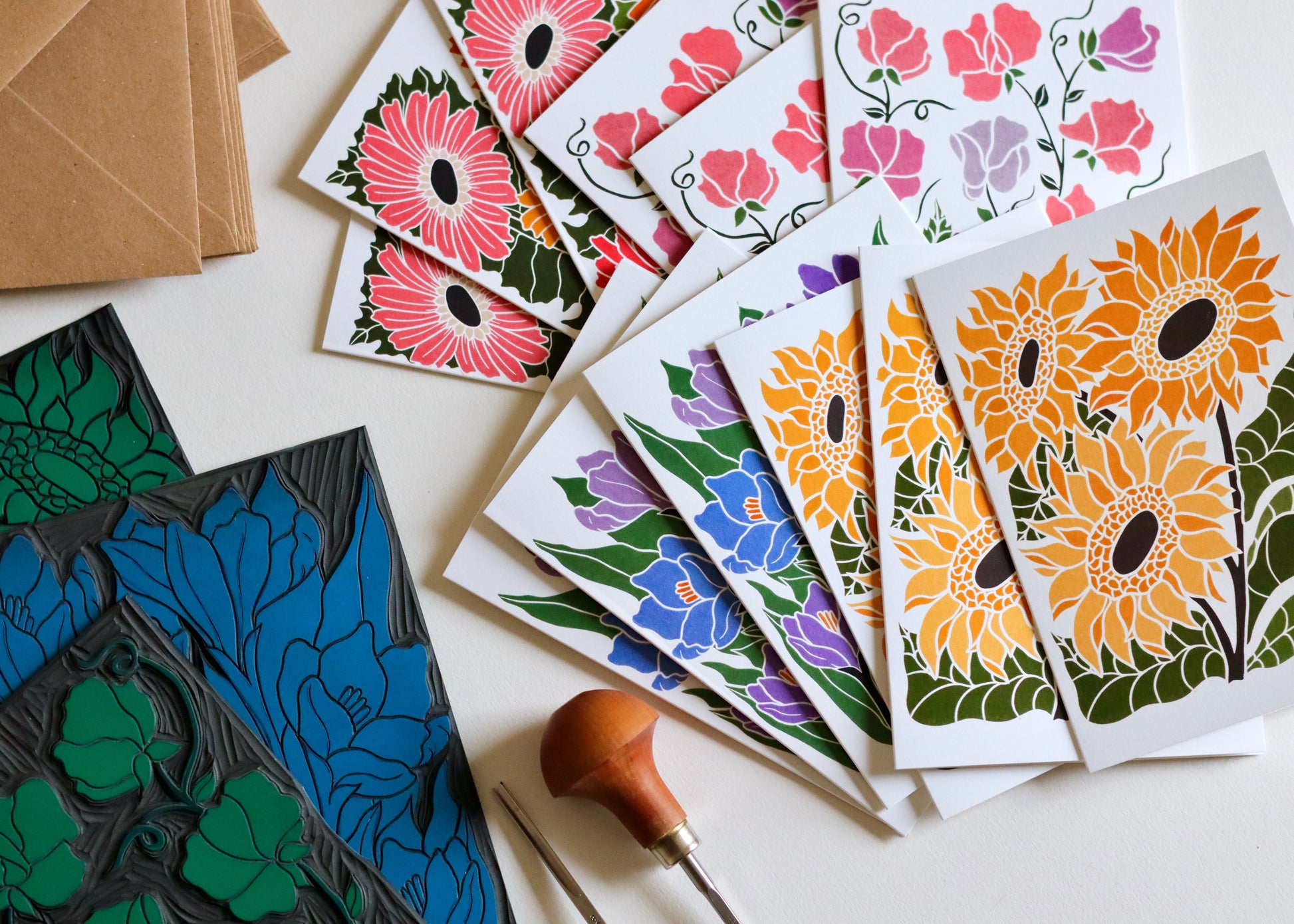 Pamela is a British printmaker working from her Norfolk studio, she creates botanical portraits that celebrate Britain's seasonal flowers - from humble garden daisies to dramatic woodland blooms. Each design begins as hand-sketched studies, lovingly carved into lino blocks and traditionally hand-printed, before being thoughtfully developed with contemporary digital colour palettes. Her work combines heritage printmaking techniques with modern stationery design, bringing the changing seasons to correspondence one flower at a time.