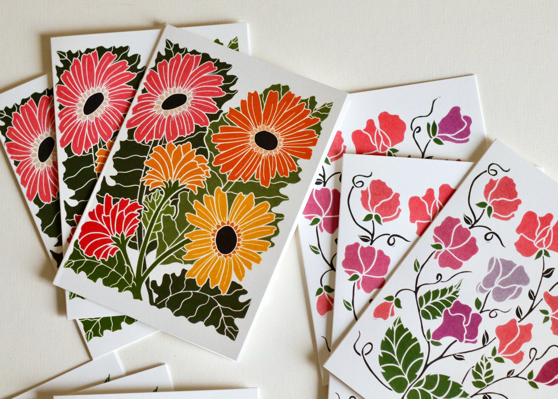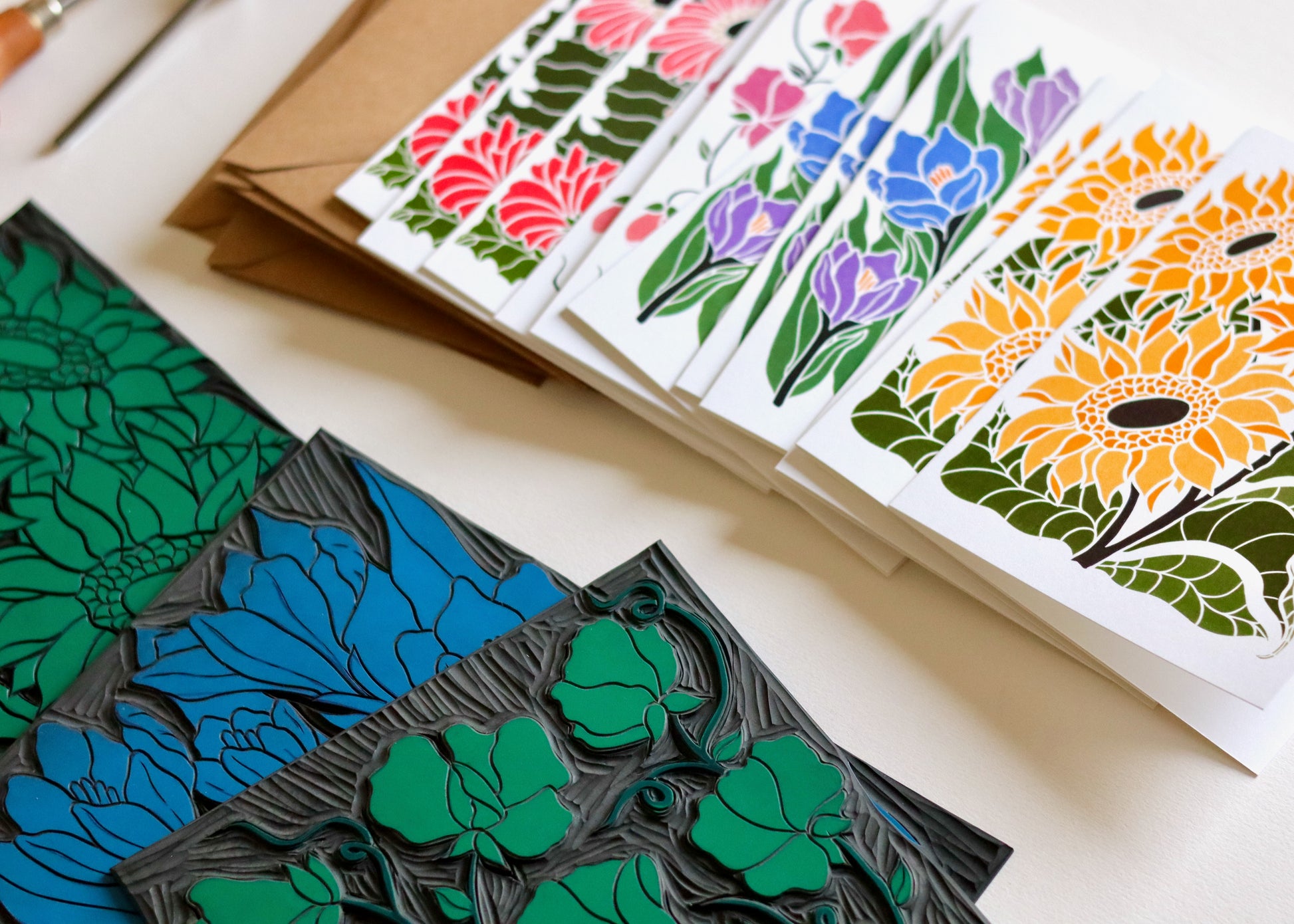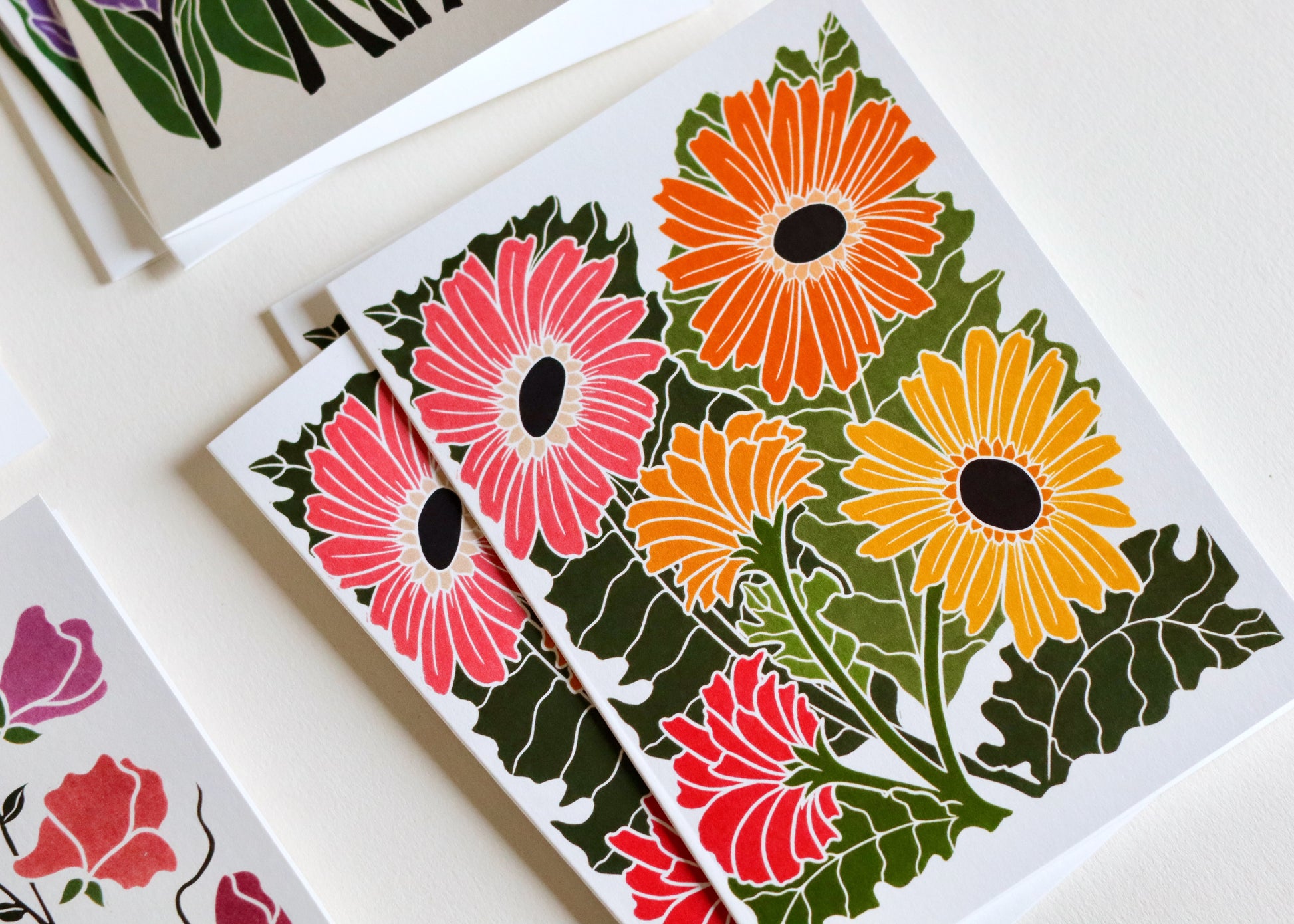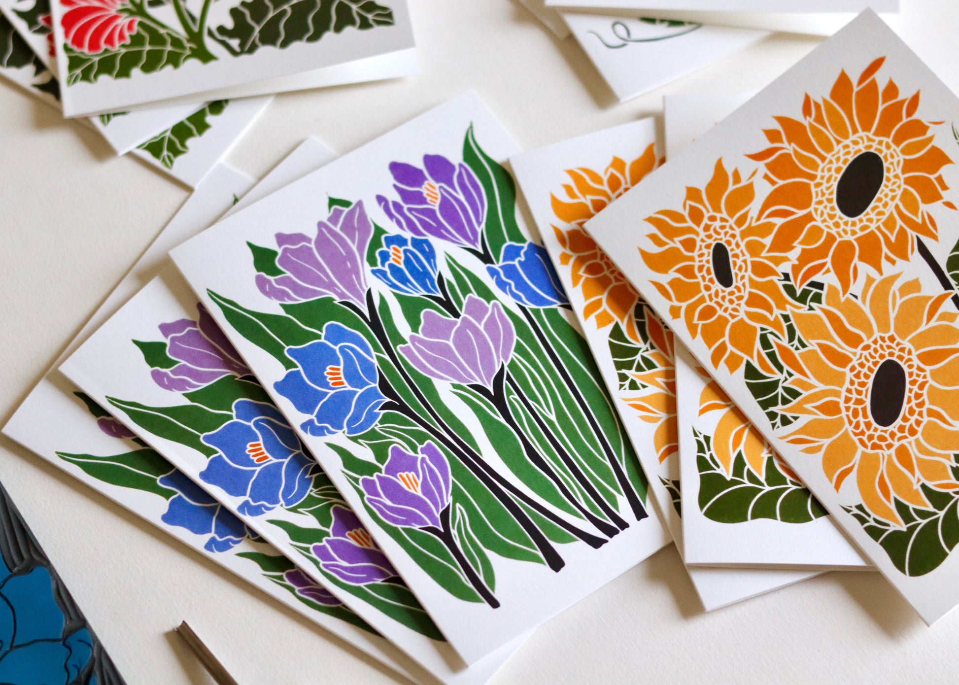 Pamela is a British printmaker working from her Norfolk studio, she creates botanical portraits that celebrate Britain's seasonal flowers - from humble garden daisies to dramatic woodland blooms. Each design begins as hand-sketched studies, lovingly carved into lino blocks and traditionally hand-printed, before being thoughtfully developed with contemporary digital colour palettes. Her work combines heritage printmaking techniques with modern stationery design, bringing the changing seasons to correspondence one flower at a time.