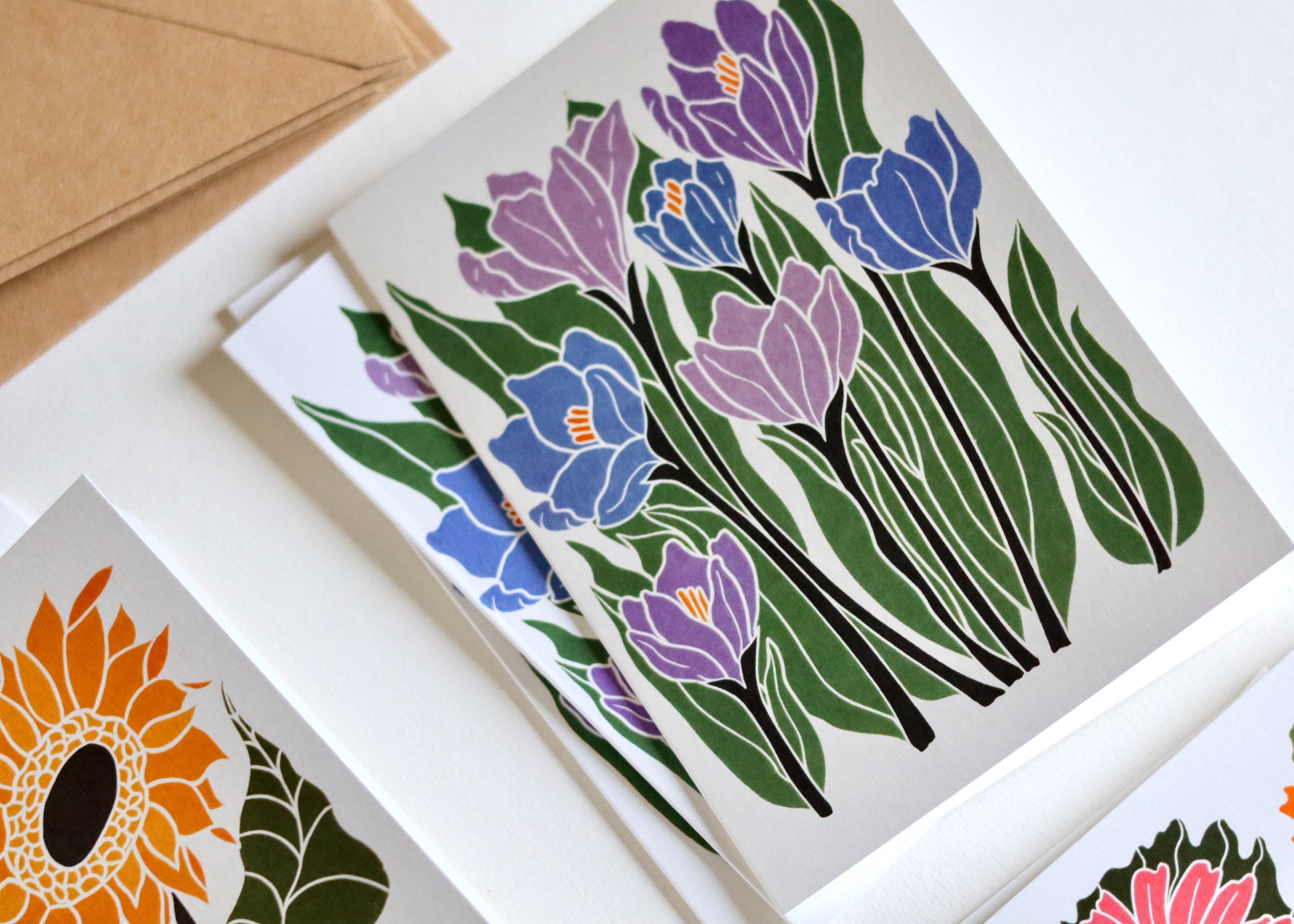 The collection includes three cards of each design, letting you share different moments of garden beauty throughout the year. From the first brave crocuses pushing through winter soil to high summer's towering sunflowers, each design tells a story of nature's resilience and beauty.
