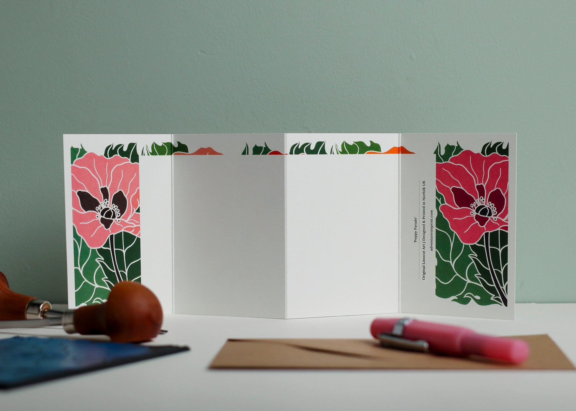 The flowing linocut technique brings out the characteristic papery texture of poppy petals, while the concertina format allows the design to unfold dramatically—much like discovering these vibrant wildflowers during a countryside walk.