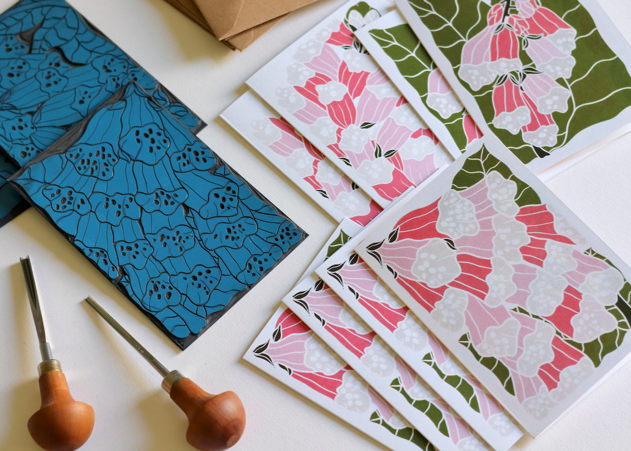 Share a touch of British woodland magic with these enchanting foxglove notecards. This beautiful set of 8 notecards features 3 unique foxglove designs from my latest linocut collection, celebrating one of Britain's most beloved and folkloric wildflowers. Each design captures the elegant bell-shaped blooms in my signature modern style, combining traditional hand-printing techniques with contemporary colourways.