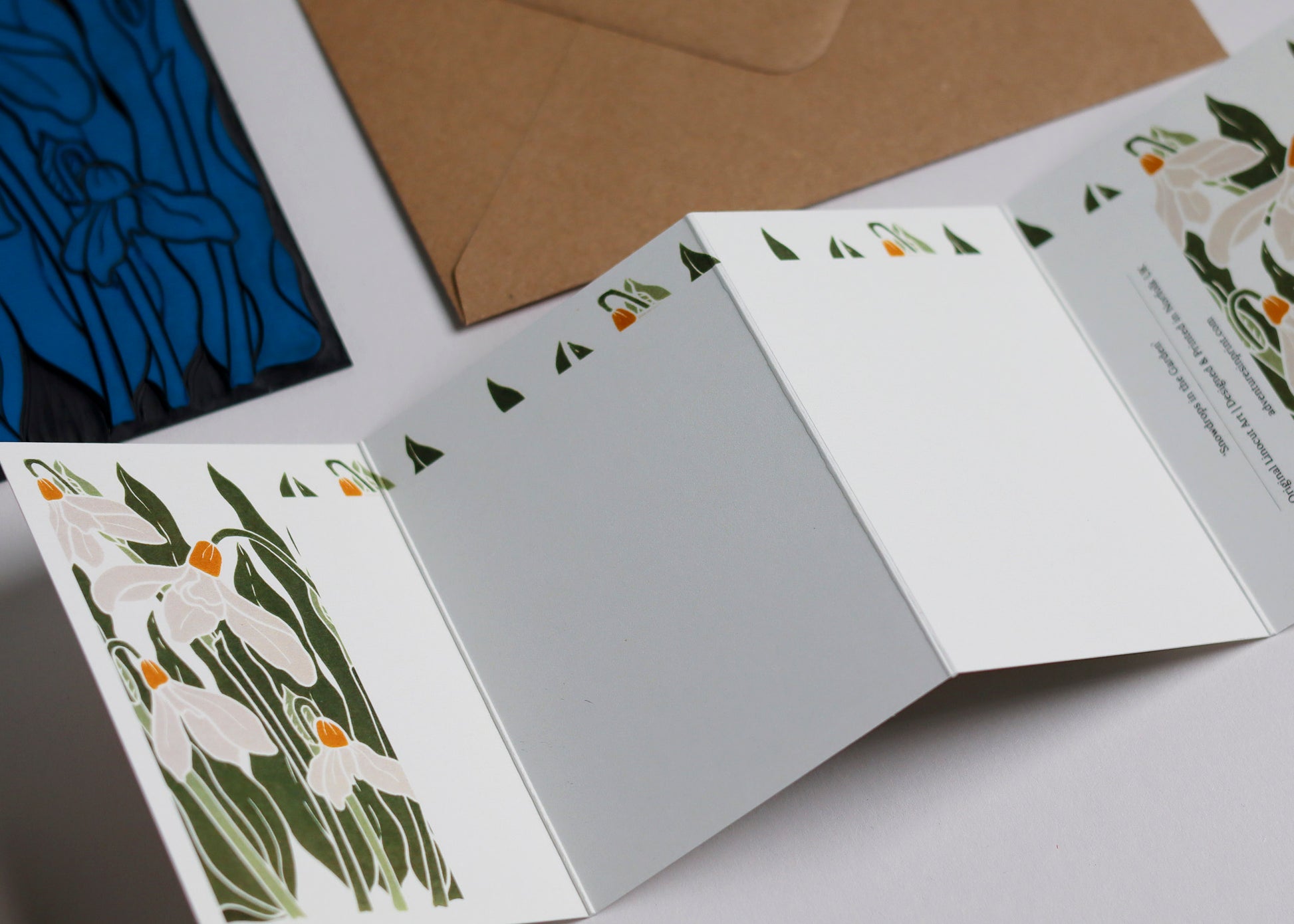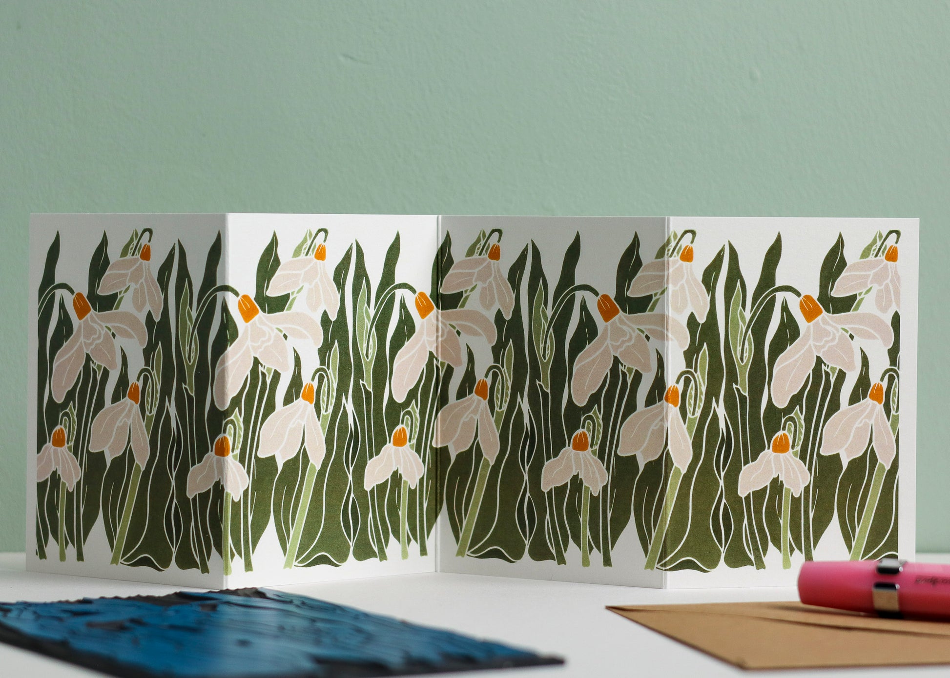 This linocut design captures a cluster of snowdrops in their natural grace - pendant flowers bowing gently, in fresh greens and soft creams. The first design in The Classic British Garden Collection - 26 hand-carved British garden flowers celebrating a year of nostalgic, heart-warming blooms.