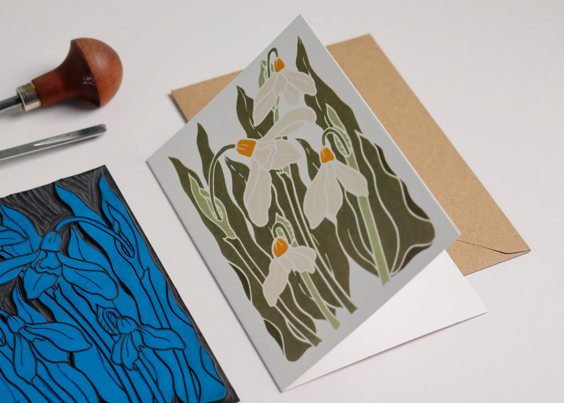 This linocut design captures a cluster of snowdrops in their natural grace - pendant flowers bowing gently, in fresh greens and soft creams. The first design in The Classic British Garden Collection - 26 hand-carved British garden flowers celebrating a year of nostalgic, heart-warming blooms.