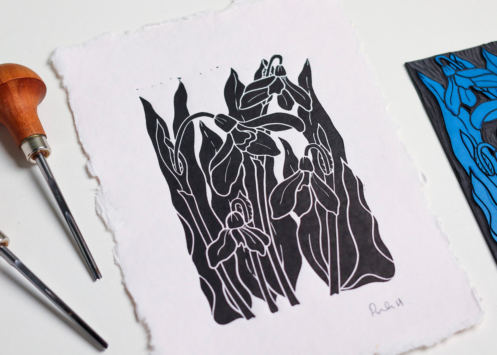 This handcarved linocut captures a cluster of snowdrops in their natural grace - flowers bowing gently with leaves reaching upwards. Each line carved with care in my Norfolk countryside studio using traditional printmaking techniques.