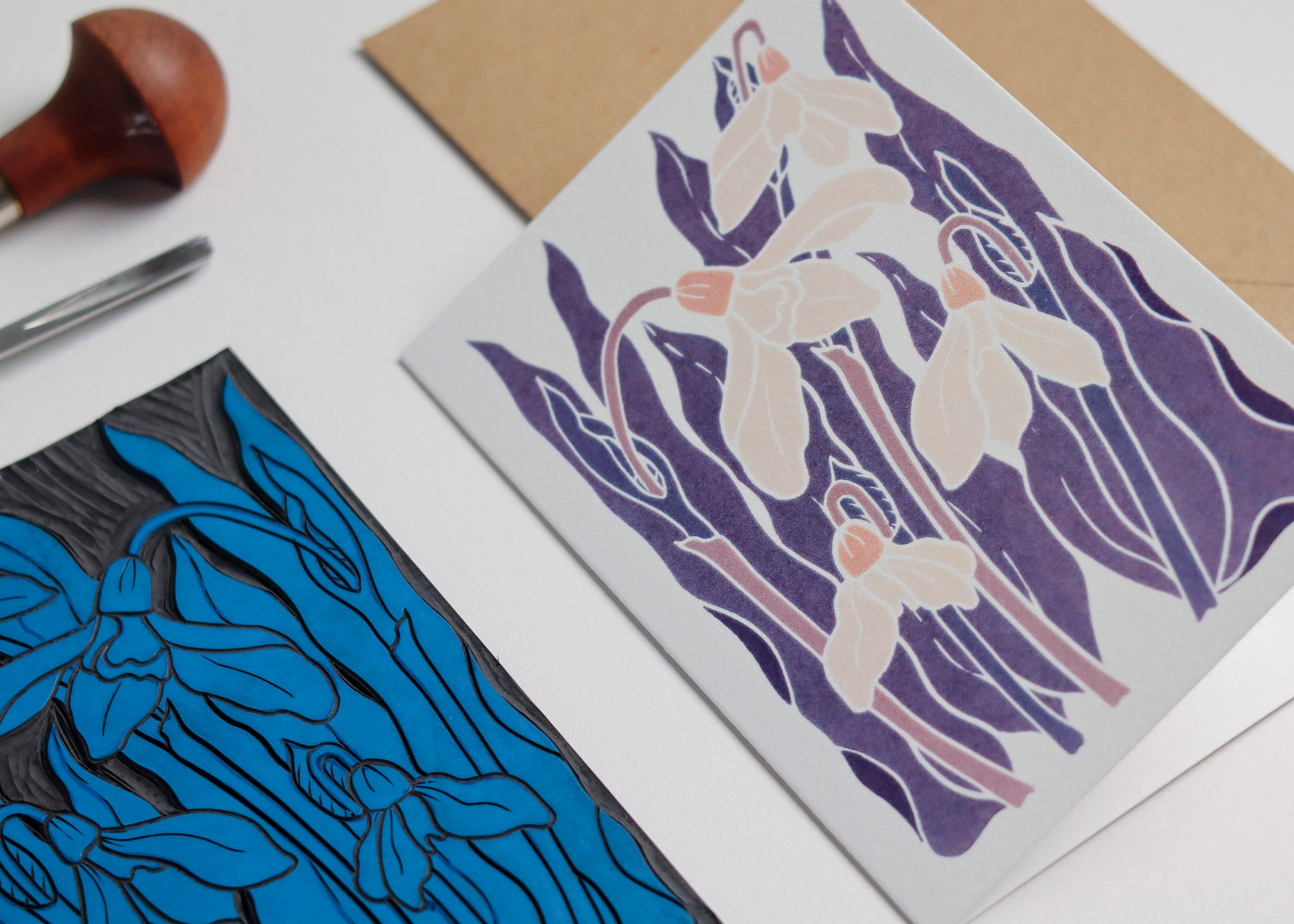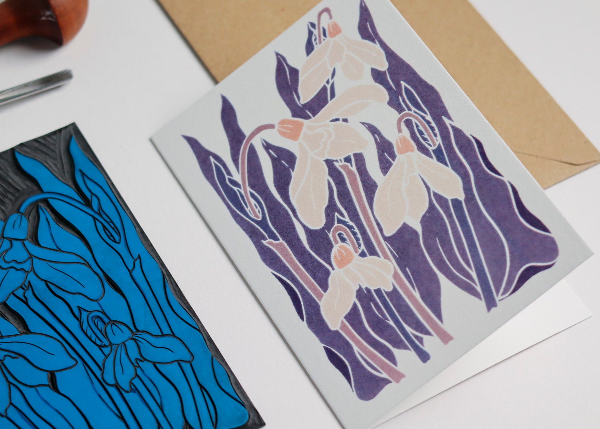 This linocut design captures a cluster of snowdrops in their natural grace - pendant flowers bowing gently, in fresh greens and soft creams. The first design in The Classic British Garden Collection - 26 hand-carved British garden flowers celebrating a year of nostalgic, heart-warming blooms.