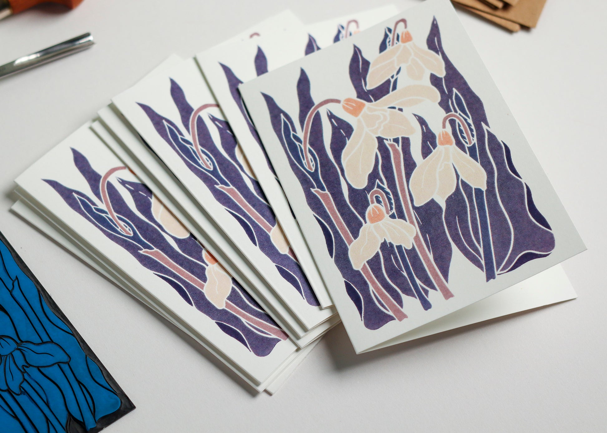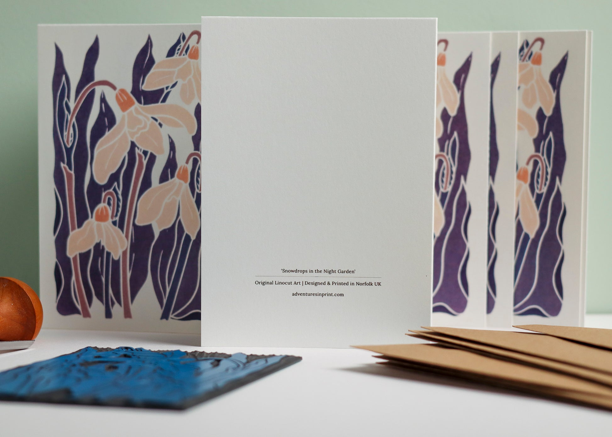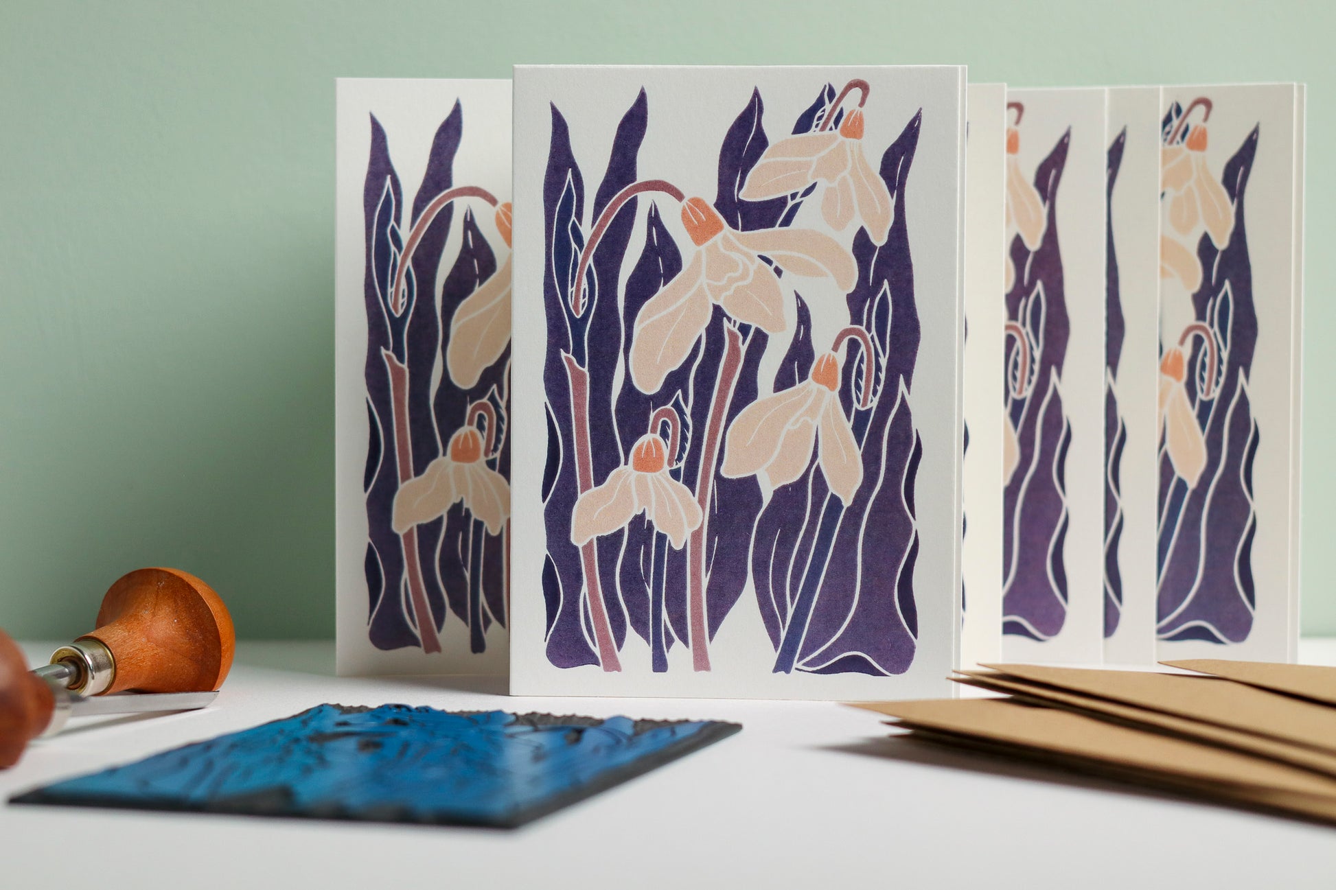 This linocut design portrays a cluster of snowdrops in shadowy purples and soft mauves, their white petals luminous against the darkness. Each line carved with care into linoleum in my Norfolk countryside studio using traditional printmaking techniques.