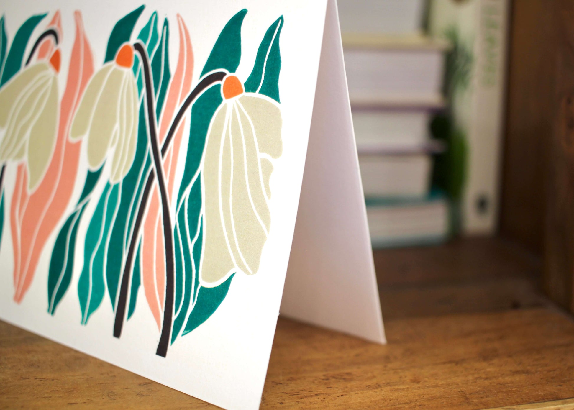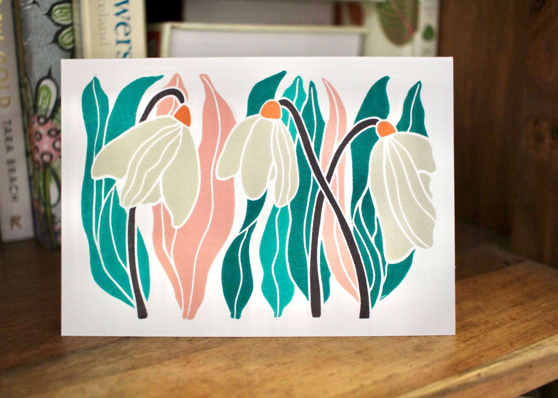 Snowdrops, the birth flower for January and one of the first flowers you'll encounter before Spring. A sign of the changing season and new beginnings. This greeting card features modern linocut artwork and was originally created using traditional relief printmaking techniques.