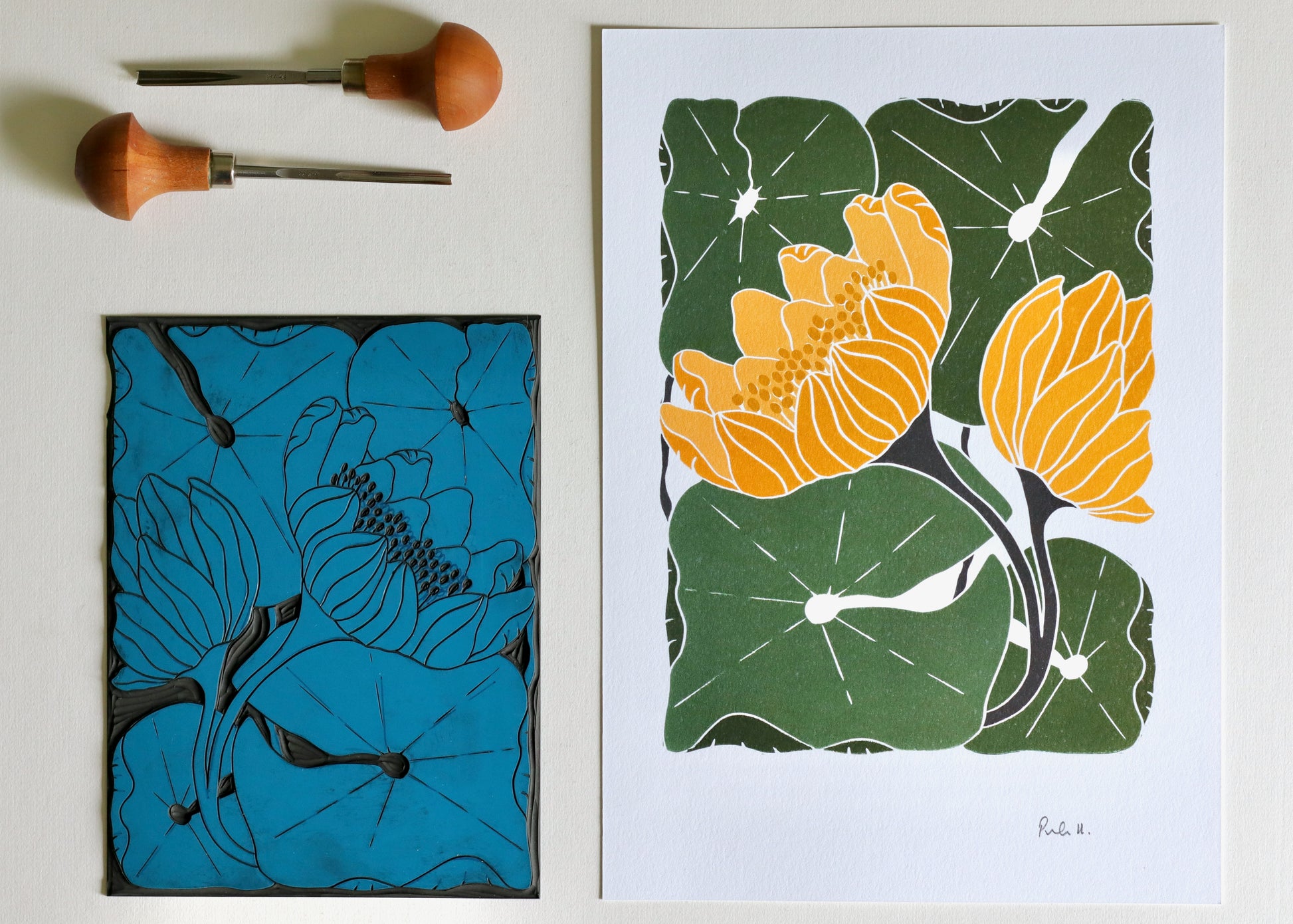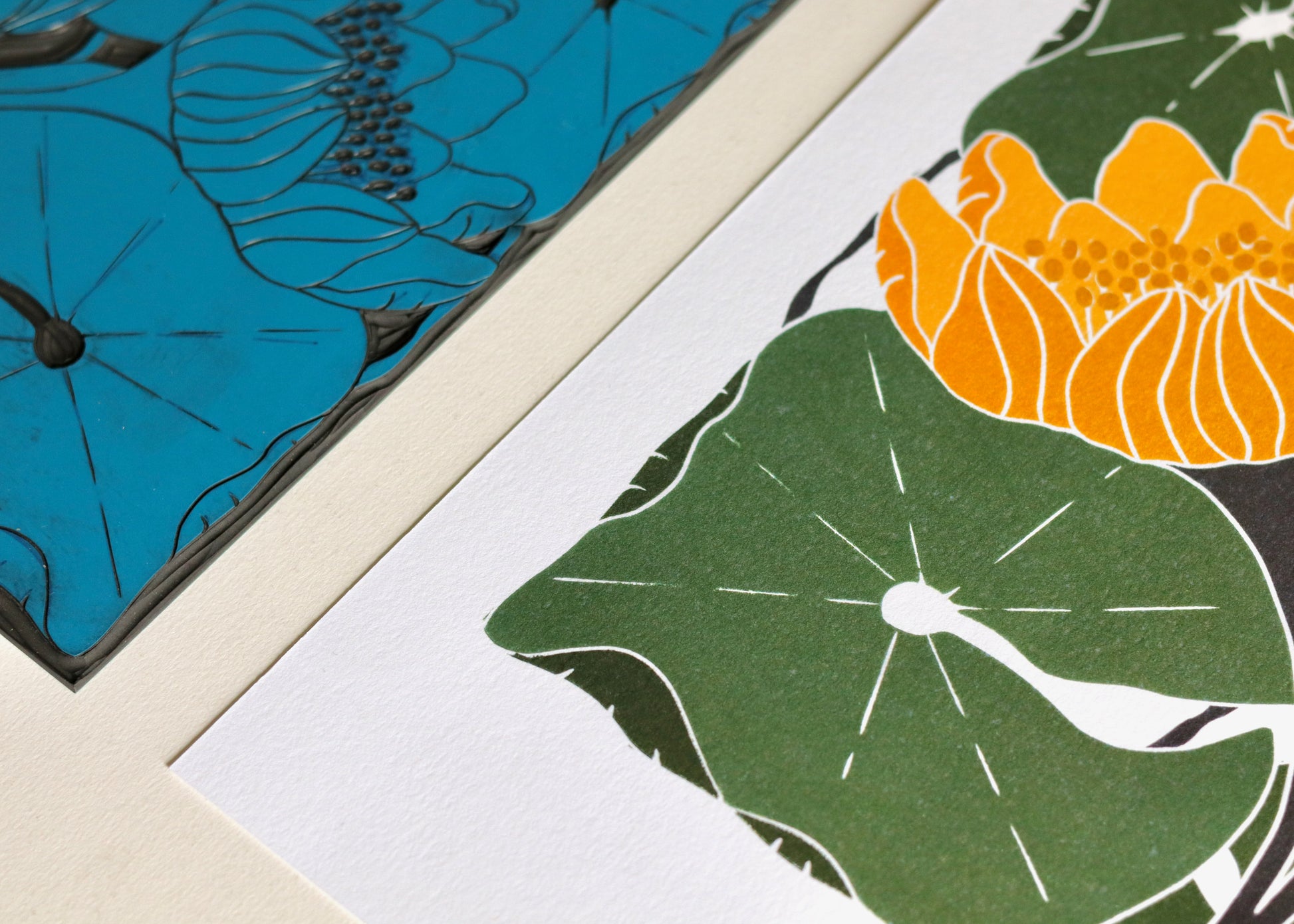 Summer Water Lilies Linocut Art Style 2 | A5 or A4 Art Print on Cotton Paper