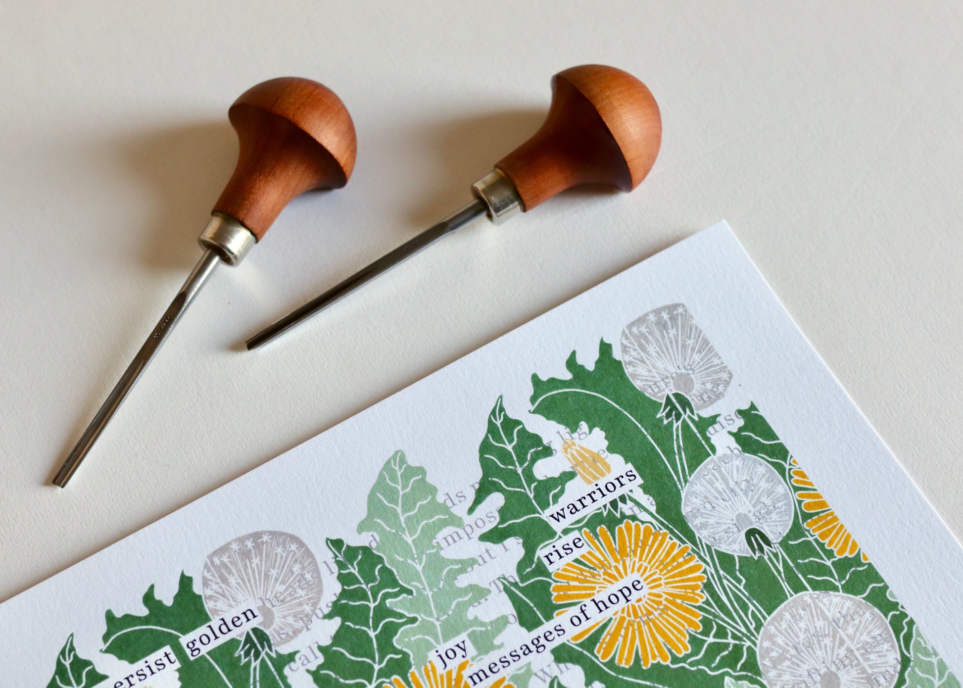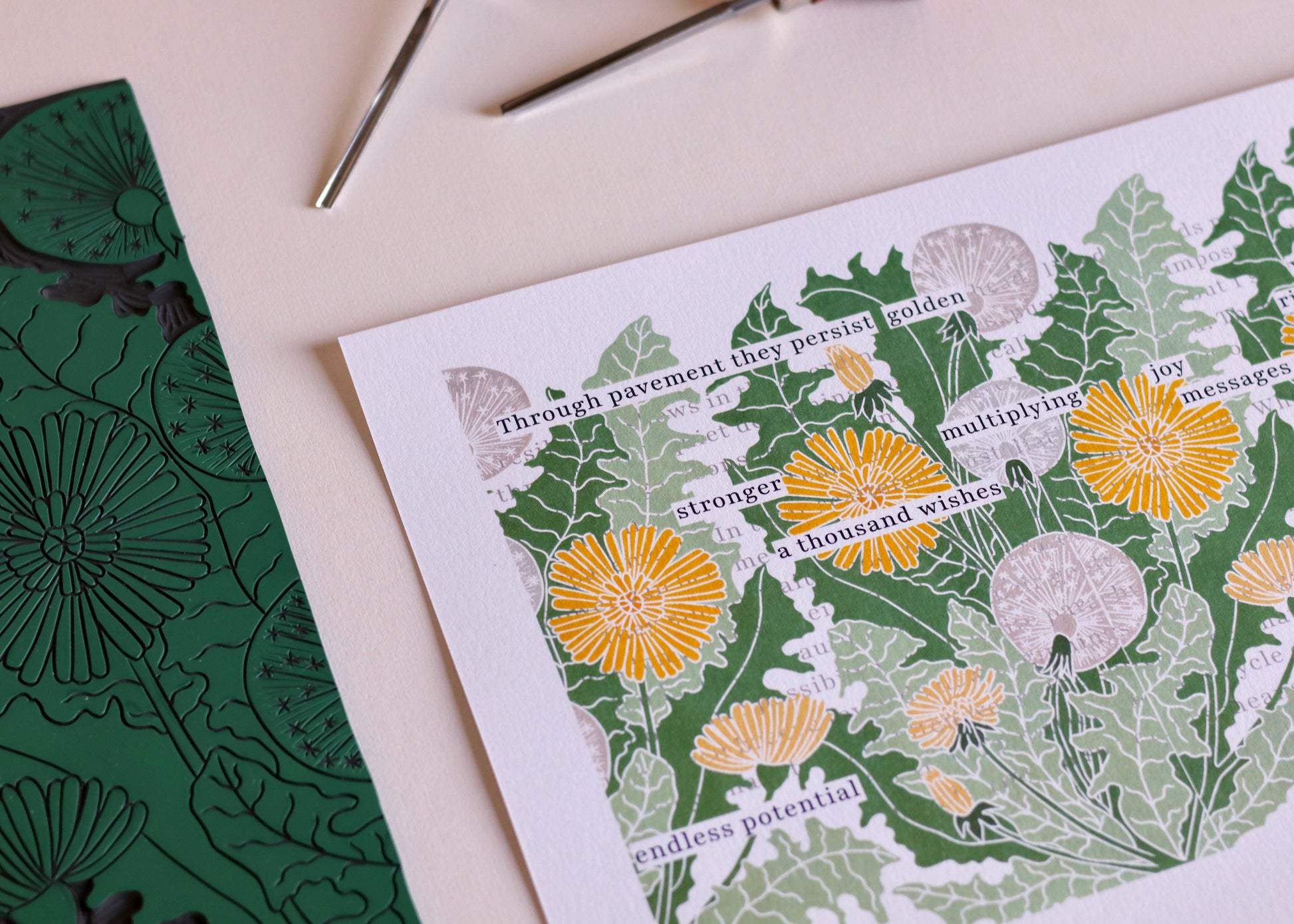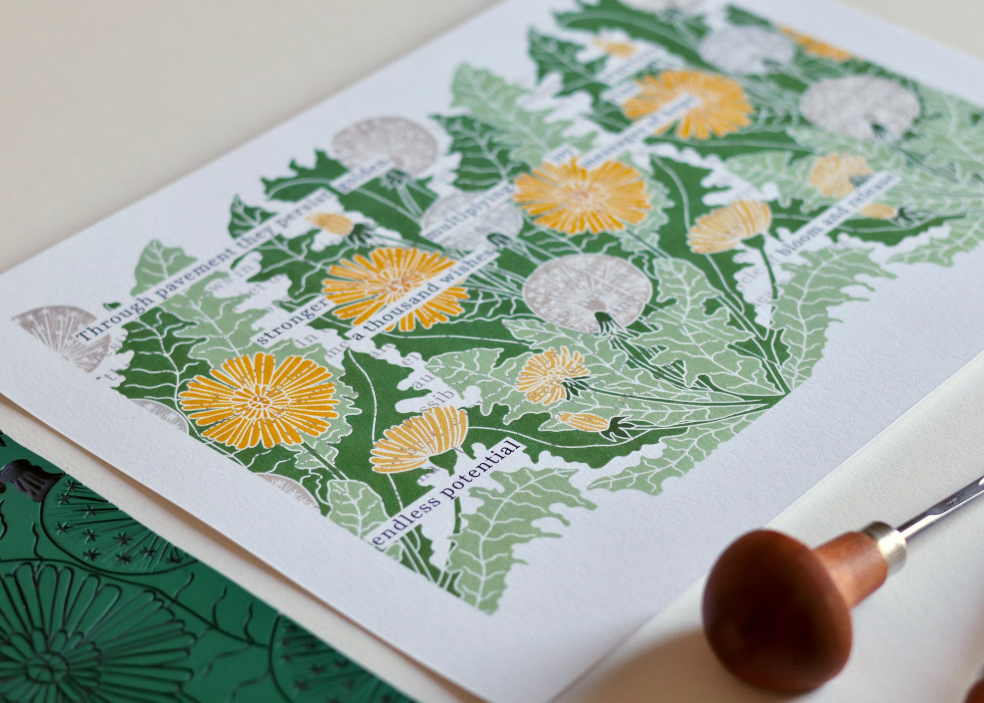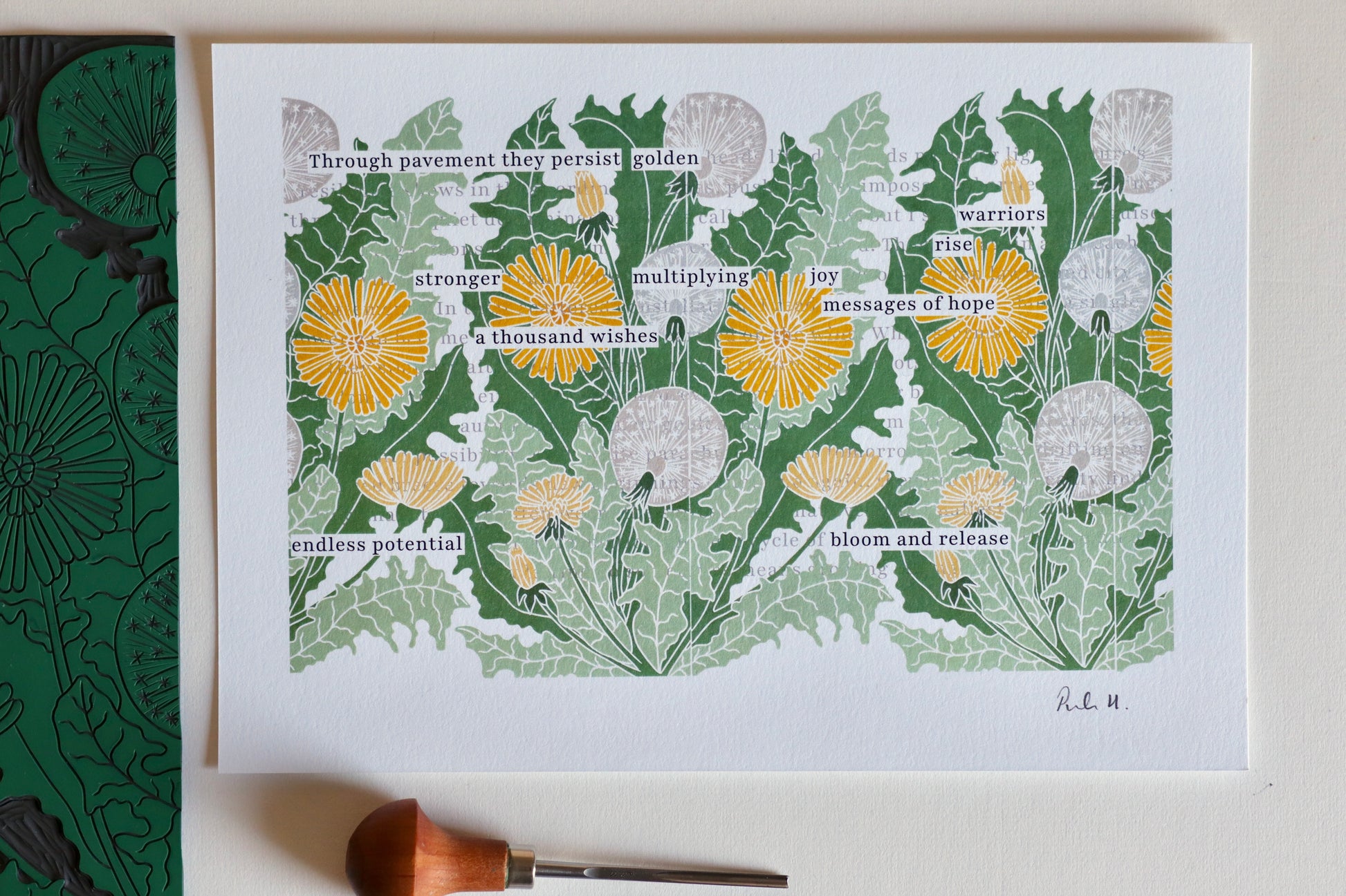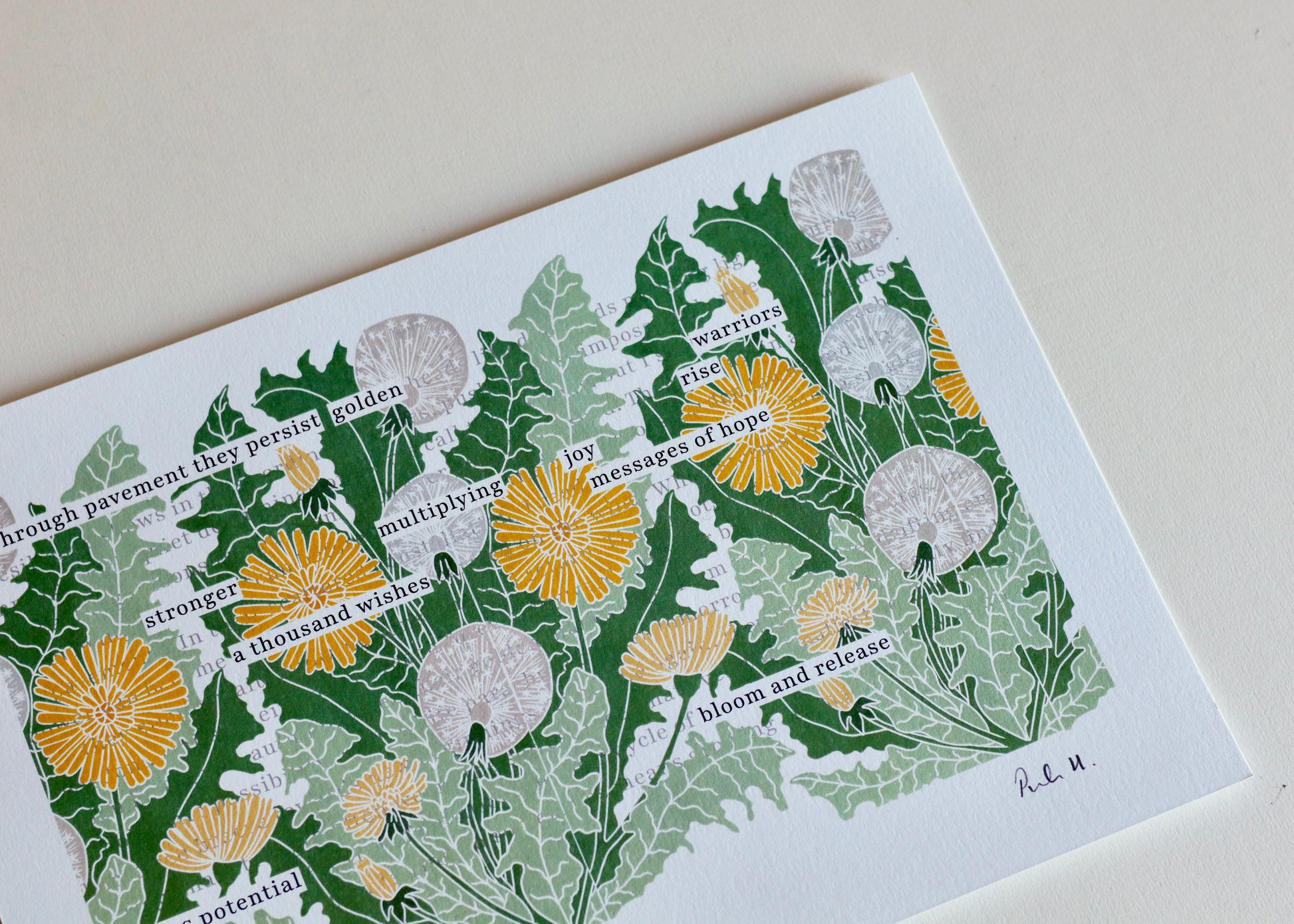 The original text, visible in fragments beneath the botanical linocut design, explores themes of persistence and hope. Selected words emerge like dandelions through the pavement, telling their own story ofresilience and renewal. Each golden bloom and silvery seedhead is printed over the text, creating a harmonious layering of meaning and form.