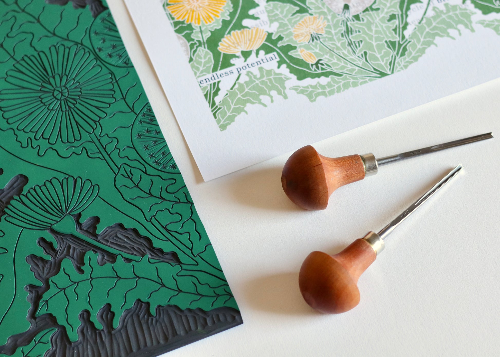 A fusion of traditional printmaking and literary art, this original piece celebrates the quiet strength found in nature's most persistent flower; the dandelion. Blackout poetry, an art form that creates new meaning by thoughtfully selecting words from an existing text, transforms a passage about nature's resilience into a powerful found poem. The carefully preserved words weave between an original hand-carved dandelion artwork, creating a visual dialogue between text and image.