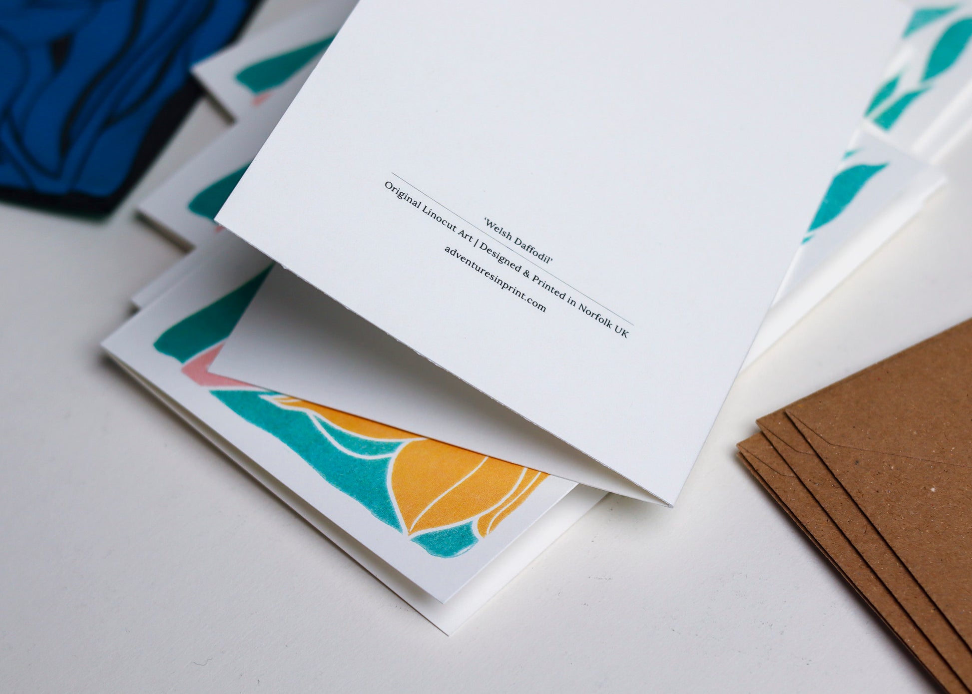 A luminous celebration of Wales' national flower, carved in my Norfolk studio with the golden optimism of early spring. The daffodil - that first brave herald of warmer days - captured in all its trumpet-bearing glory. Featuring bold yellow petals against a backdrop of sword-like leaves in soft teals and corals, creating a design that feels both botanical and painterly. There's something wonderfully hopeful about daffodils, the way they push through late winter soil and fill hedgerows with sunshine.